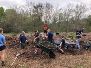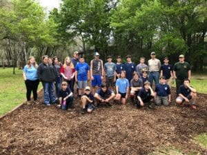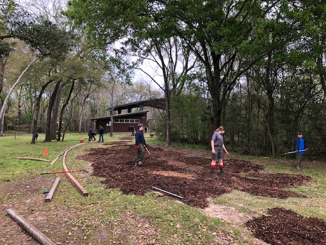 Community service is a key element of the Scouts BSA program and allows members of the troop to keep their promise to “help other people.” This commitment was on full display on March 7 when Troops 584 and 1584 conducted a service day at the YMCA Camp Cinco in Cinco Ranch. The scouts spent the day creating a new access route to the activities pavilion from the main road. The 25 youth involved in the project laid timbers to line the route and hauled seemingly endless wheel barrels of mulch to complete the path and make Camp Cinco a better facility for everyone in the community