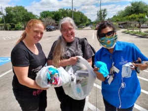 Volunteers are already sporting some of the 100 fabric masks made so far by Audrey Adams, Shelia Chatman, Leena Dees, and Catie and Trish Long, using fabric and materials donated by the JOANN Fabric and Craft store in Sugar Land.
