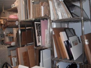 Large paintings should be stored off the floor, preferably hanging up even in storage locations. If there is no room for a hanging storage solution, then store large paintings standing upright in a closet or storage area. While it may seem like a convenient place to store paintings, never lay paintings flat, face up under a bed. This will put stress on the stretchers and the canvas itself. Smaller paintings may be stored upright back to back and face to face on separated shelves. Use acid free foam core dividers to prevent the wire from the back of one painting from scratching the frame or canvas on the front of another painting positioned next to it. There are specific techniques to protecting art, a good rule of thumb is to handle with care, display works of art away from direct sunlight and store works in areas where temperature and humidity fluctuations are minimal.