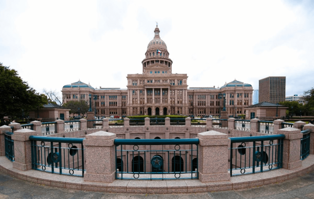 View of the Texas Capitol from the north side with the view of underground rotunda