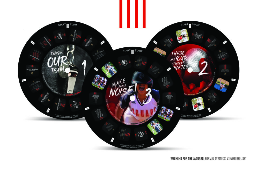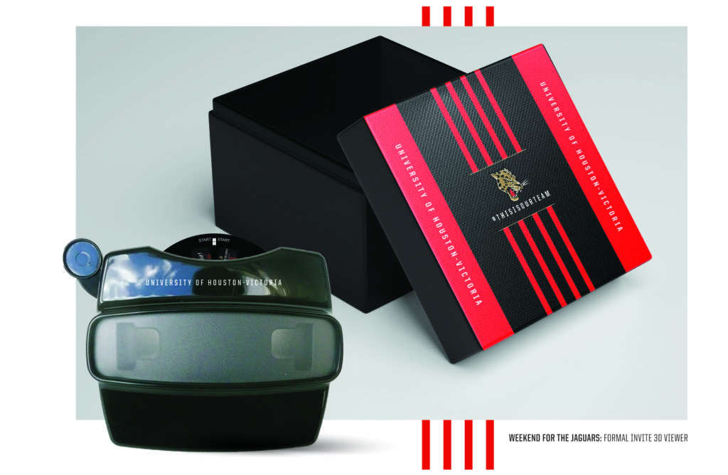 The pieces were created by graphic designer Larzell Cowan and included a save-the-date mailer, and a formal invite featuring a gift box containing a 3D viewer with a reel set highlighting UHV athletes.