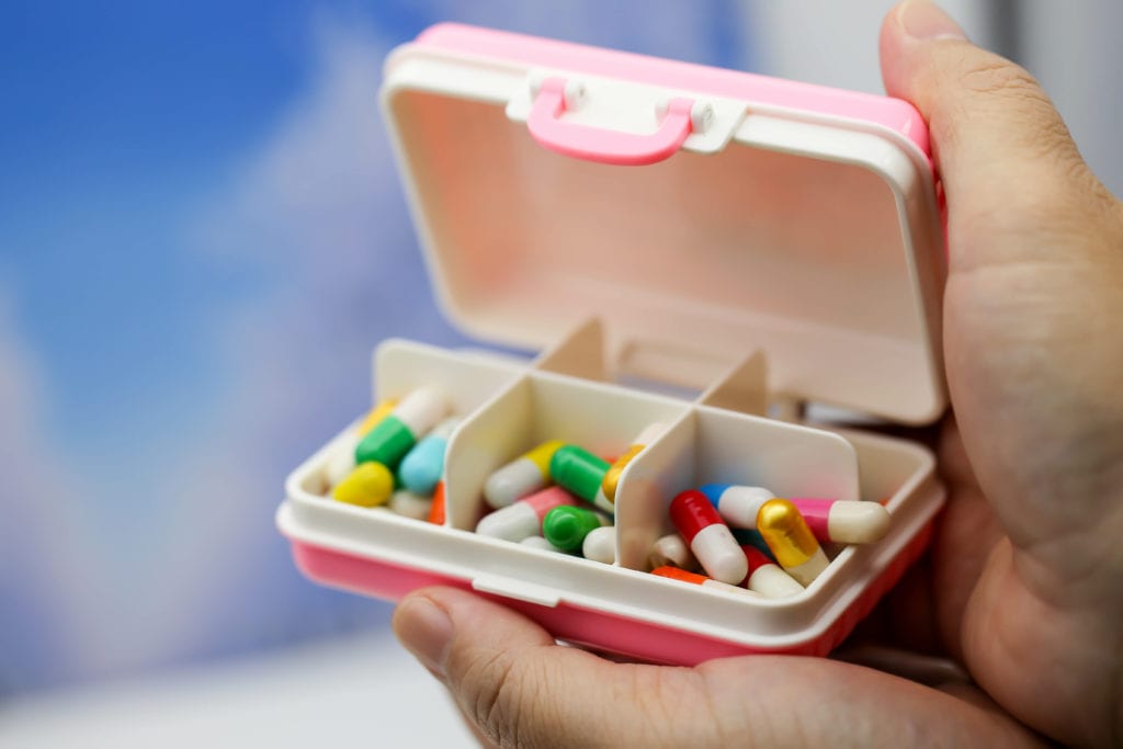Close up Hand picking up capsule drug from plastic pill box. Health care and medical concept.