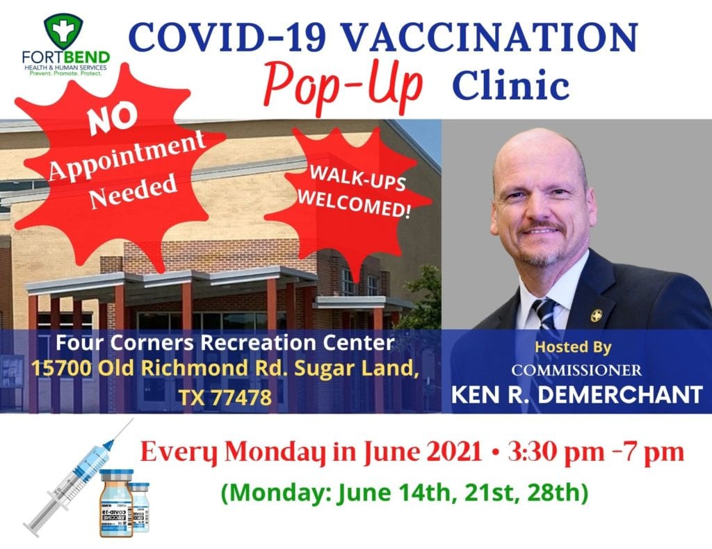 Fort Bend County Health and Human Services (FBCHHS) will be at the Four Corners Recreation Center in Sugar Land every Monday in the month of June from 3:30 PM to 7 PM to provide vaccinations without an appointment. The event is hosted by Fort Bend County Commissioner Ken R. DeMerchant of Precinct 4.