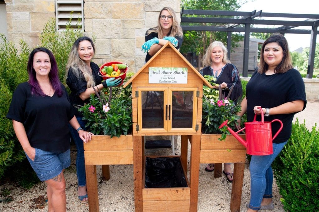 Members of Cane Island’s Garden Club proudly unveil the community’s new Seed Share Shack. Shown l. to r. are Mandy Kleinman, Jenny Kincaid, Danielle Gilman, Diana Porter and Corrine Provoast