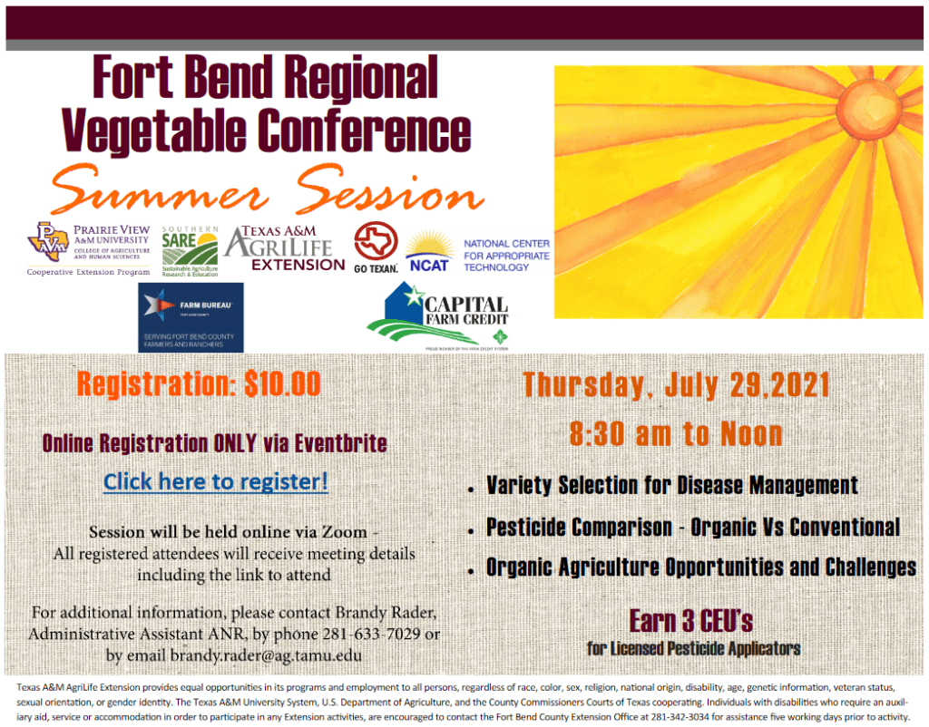 To register, go to https://www.eventbrite.com/e/fort-bend-regional-vegetable-conference-summer-session-tickets-160842268555. The deadline to register is 4 p.m. July 28. There will be no in office registrations. Registrants will receive meeting details, including a link to attend the conference. For general questions, contact Brandy Rader at 281-633-7029 or brandy.rader@ag.tamu.edu