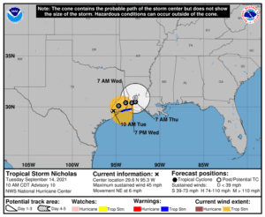 The National Weather Service said as of 10 a.m. Tuesday, Nicholas’s location is 29.6° north, 95.3° west, about 10 miles southeast of Houston, and 85 miles west-southwest of Port Arthur. Maximum sustained winds are 45 MPH. The weather service said the storm is moving northeast at 6 MPH.