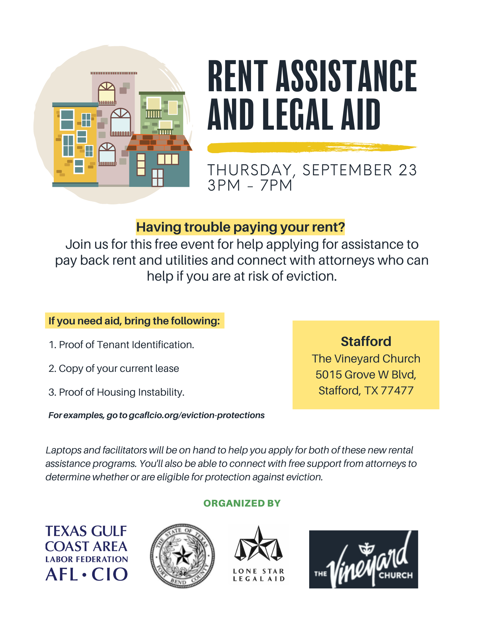 On Thursday, September 23rd from 3-7 pm, working families can get real-time help to apply for rental relief. Fort Bend County Judge KP George, Lone Star Legal Aid, the AFL-CIO, and Vineyard Church have combined resources to offer free services to assist people at risk of eviction. More than 1,200 people were helped at a recent event in Harris County in just three hours.