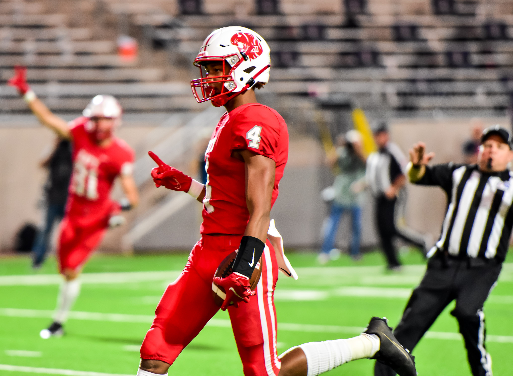 - Katy senior receiver Nic Anderson (4) hauls in a touchdown pass against Tompkins, and let’s everyone know how good the unbeaten Tigers are as he steps into the end zone. (photo by Terry Carter/UDPhotos.com)