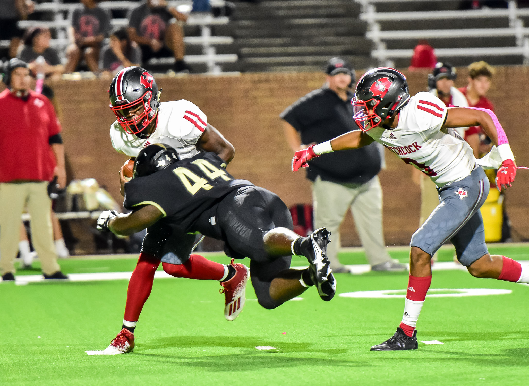 - Jordan defender Tosin Odulate (44) goes all out to bring down Hitchcock quarterback Christian Dorsey (8) on Friday at Rhodes Stadium. This defensive battle ended with Hitchcock edging the Warriors, 18-17. (photo by Terry Carter/UDPhotos.com)