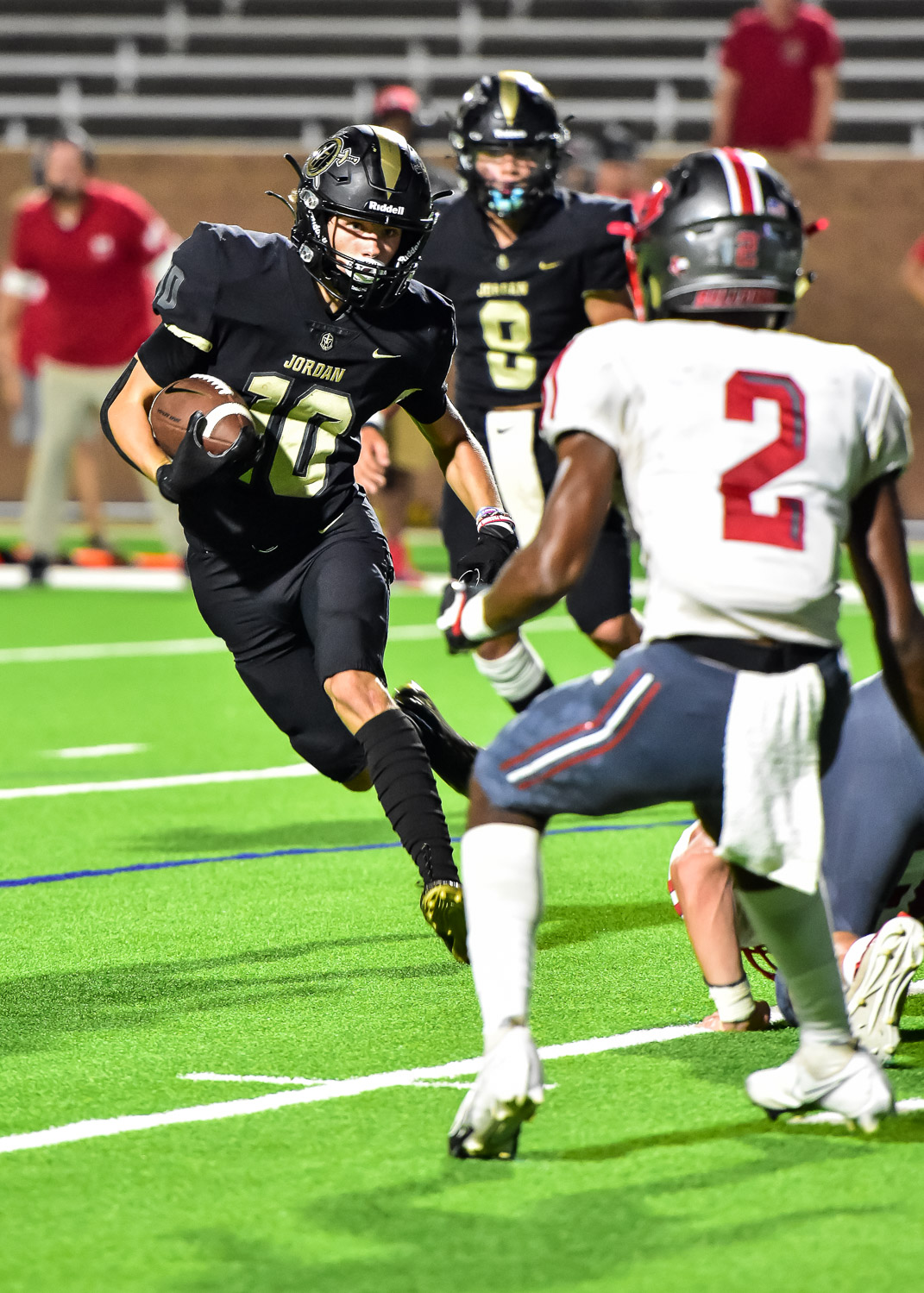 - Jordan running back Nathan Salz (10) tries to gain yardage in the fourth quarter during a defensive battle against Hitchcock. Late scores by Hitchcock and several unconverted short-yardage possessions by the Warriors resulted in an 18-17 Hitchcock victory. (photo by Terry Carter/UDPhotos.com)