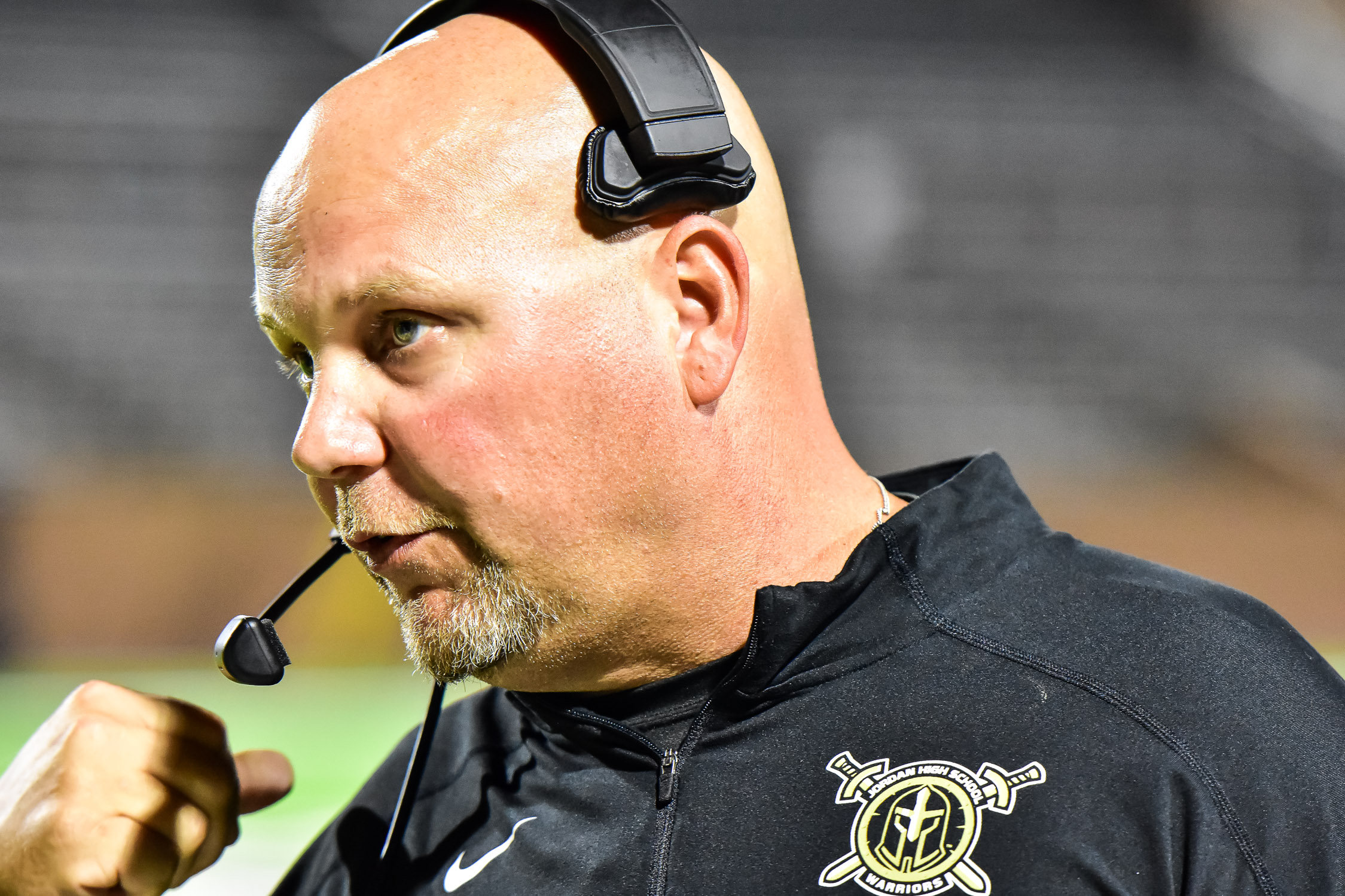 - Jordan coach Mike Rabe has some things to say during Friday’s Hitchcock-Jordan game. (photo by Terry Carter/UDphotos.com)