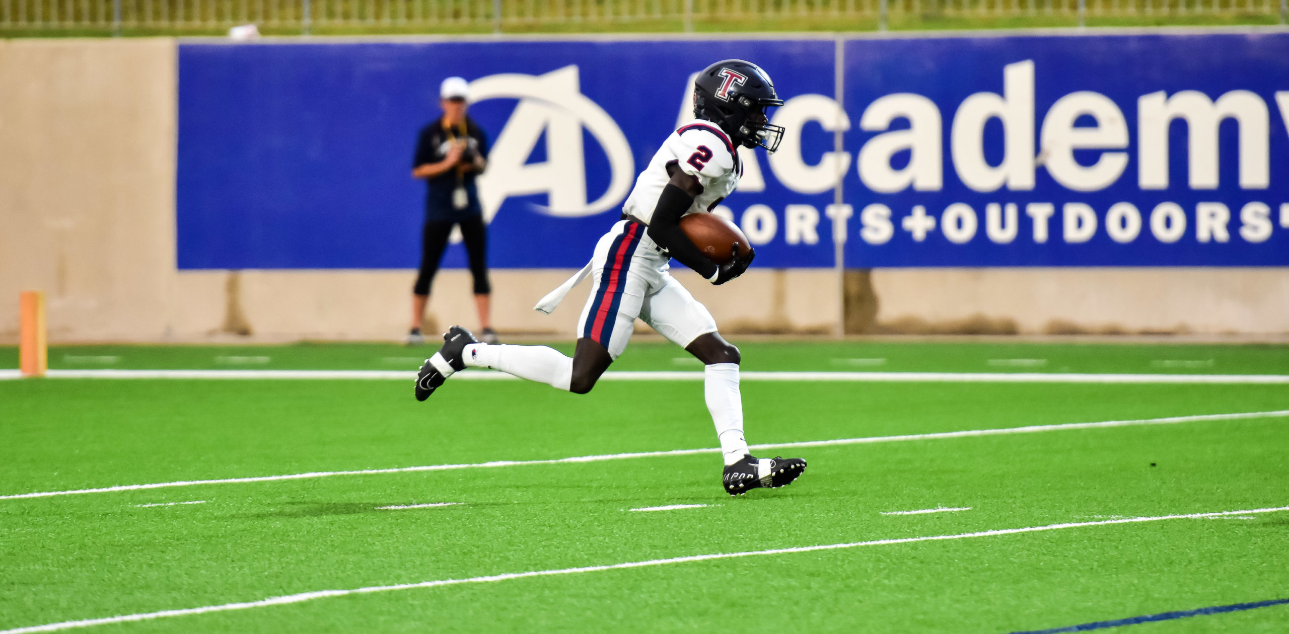 - Tompkins’ Joshua McMillan (2) returns a Katy kickoff 108 yards for one of the longest touchdown runs in Katy ISD history. The second-quarter run on Friday was one of three touchdowns for the Falcon receiver/kick returner. He caught six passes for 112 yards, including 49-yard and 30-yard touchdown connects with Tompkins quarterback Cole Francis. (photo by Terry Carter/UDPhotos.com)