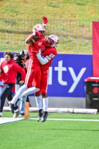 Katy Tiger receiver Nic Anderson (4) celebrates an early scoring reception with teammate Isaiah Smith (26) into the end zone. (Terry Carter/UD Photos.com photo)