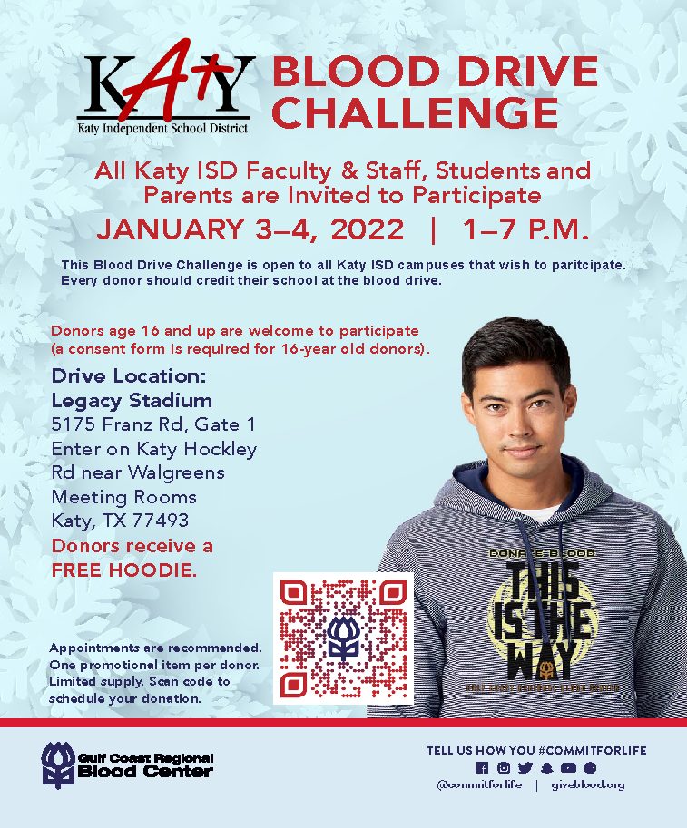 This January, in recognition of National Blood Donor Month, Katy ISD and the Gulf Coast Regional Blood Center have partnered to host a Blood Drive Challenge! The Challenge will take place at Legacy Stadium on January 3rd and 4th from 1:00-7:00 p.m. All students, parents, staff and community members are invited to come out and give back, should you be in the position to so.