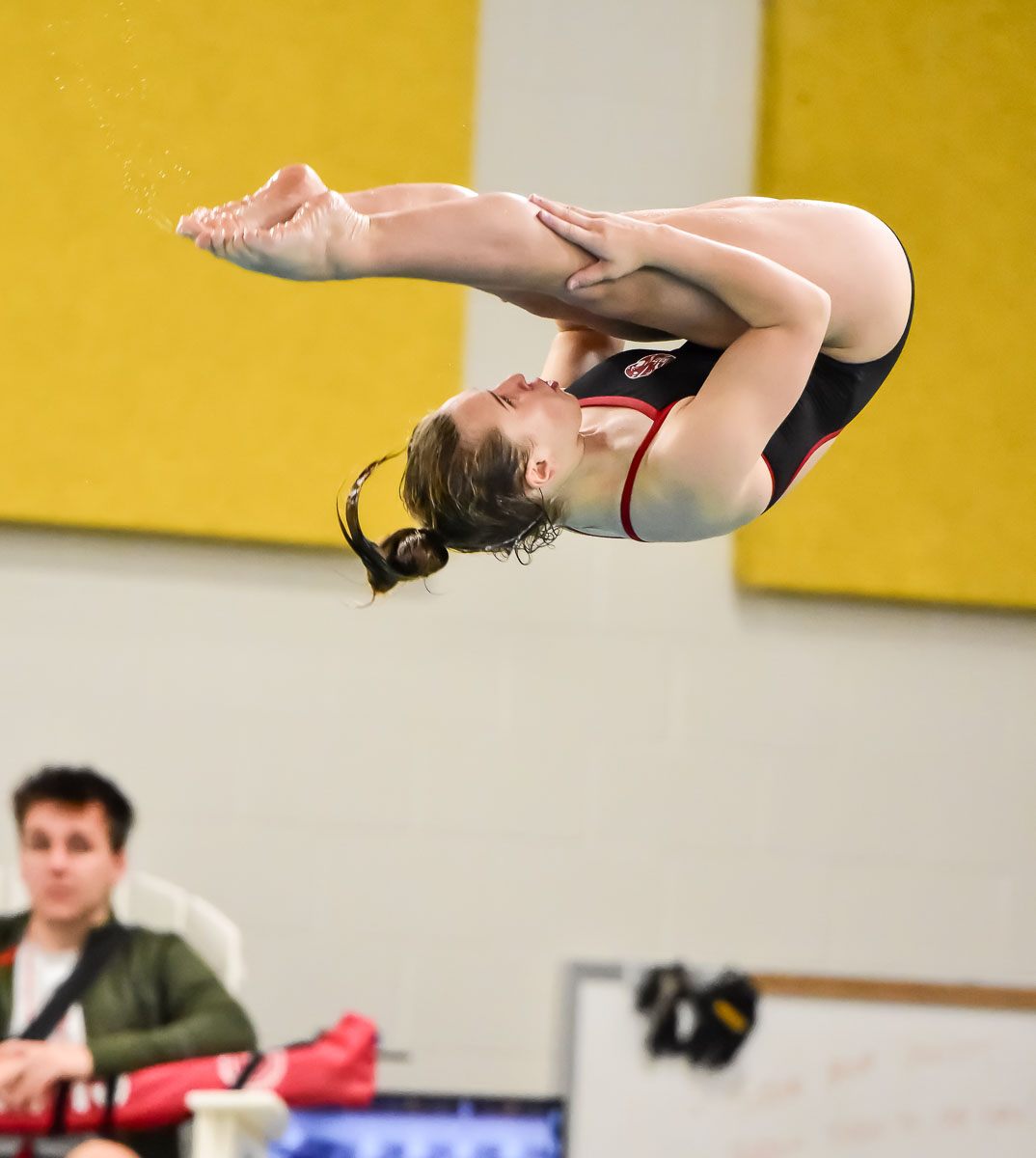 - Katy sophomore Avery Coates shows quality form on her back dive with 1.5 somersaults during Thursday’s district diving competition. Coates held off Seven Lakes’ talent Kailey Koval for the 19-6A title. Photo by UDPhotos