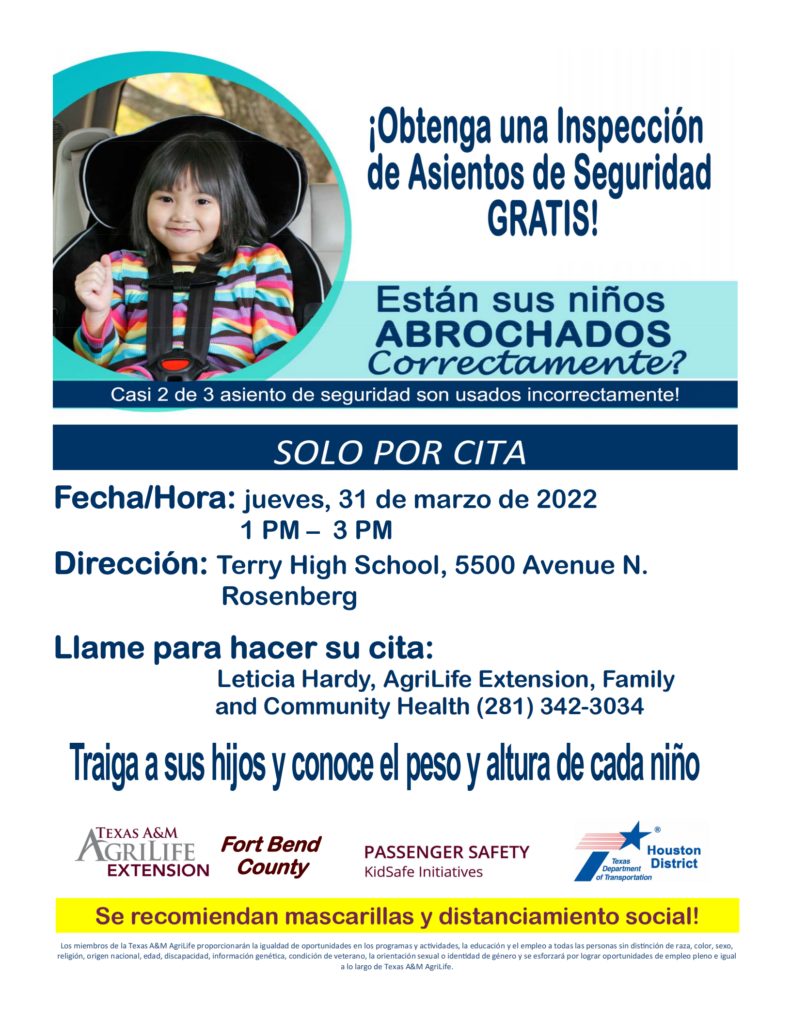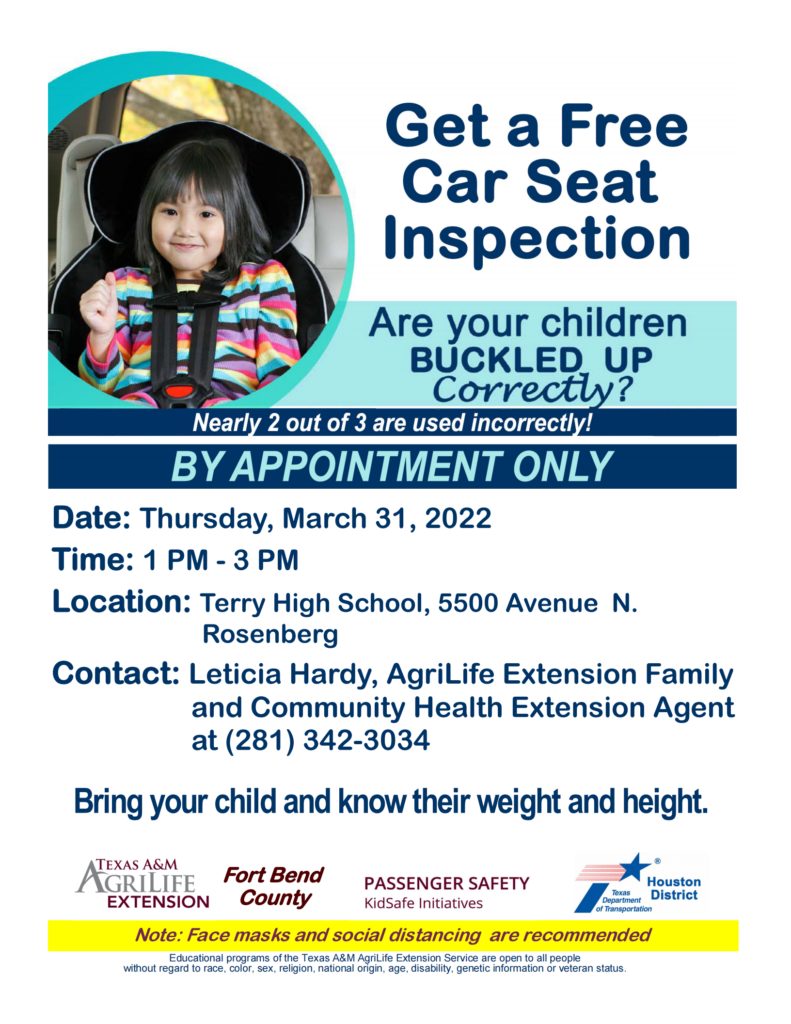 Securing your children properly in an age- and size-appropriate car seat in the back seat of your vehicle — is the most effective thing you can do to protect them in the event of a crash. That’s why Texas AgriLife Extension Agent, Leticia Hardy, is urging all parents and caregivers to attend the child safety seat checkup event on March 31, 2022. Certified technicians will be available to provide on-site child safety seat inspections and education from 1:00pm to 3:00pm at Terry High School located at 5500 Avenue N, Rosenberg, TX 77471.