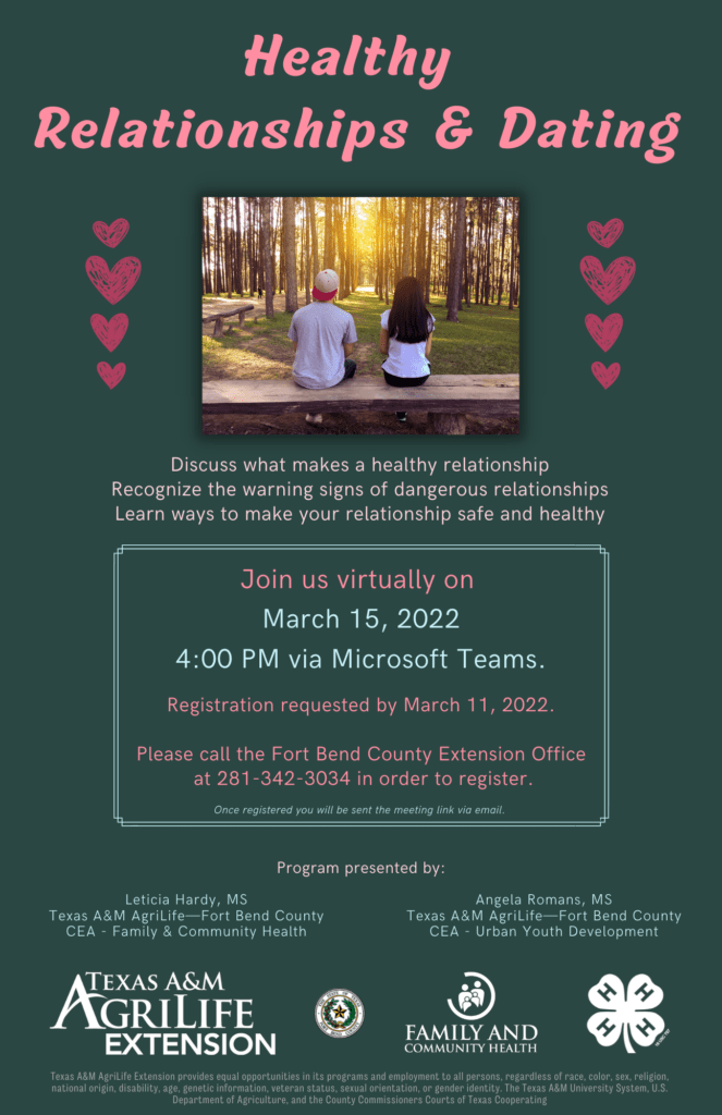 Join us virtually on March 15, 2022 at 4pm as we take a dive into Healthy Relationships and Dating. This session is completely free and open to all ages but is specifically tailored for teens and young adults. Healthy relationships involve honesty, trust, respect and open communication between partners or friends and they take effort and compromise from both people. There is no imbalance of power. Partners respect each other’s independence, can make their own decisions without fear of retribution or retaliation, and share decisions. Relationships may be defined in different ways depending on who’s involved, but healthy relationships all depend on a few key elements such as trust, openness and honesty, mutual respect, affection, good communication, give-and-take. Registration is required for this event. Please contact Victoria Zwahr at 281-342-3034 or by email at Victoria.zwahr@ag.tamu.edu to register to attend the session no later than Friday, March 11, 2022. Upon registration a participation link will be emailed to you. Any questions about the session can be directed to Leticia Hardy at 281-342-3034.