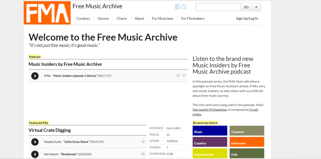 Free Music Archive was established in 2009 by East Coast radio station WFMU, which is a storehouse for unrestricted original songs submitted by indie musicians. It offers a basic and smooth UI that can be easily navigated. And everyone can browse music by genres and sub-genres it has to offer. Moreover, users may create music playlists on the web’s player. Or download songs and share them under a Creative Commons license.