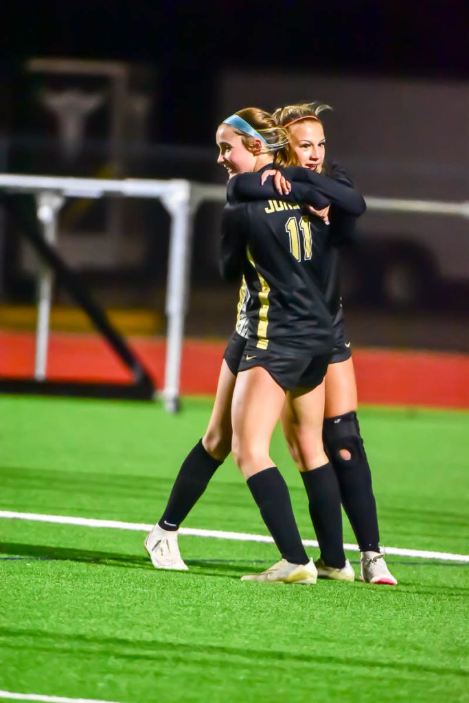 - Jordan players Perio Olmo (11) and Maddie Thompson (23) celebrate taking a 1-0 lead over College Station in a key District 19-5A soccer match on Tuesday. Photo by UDPhotos