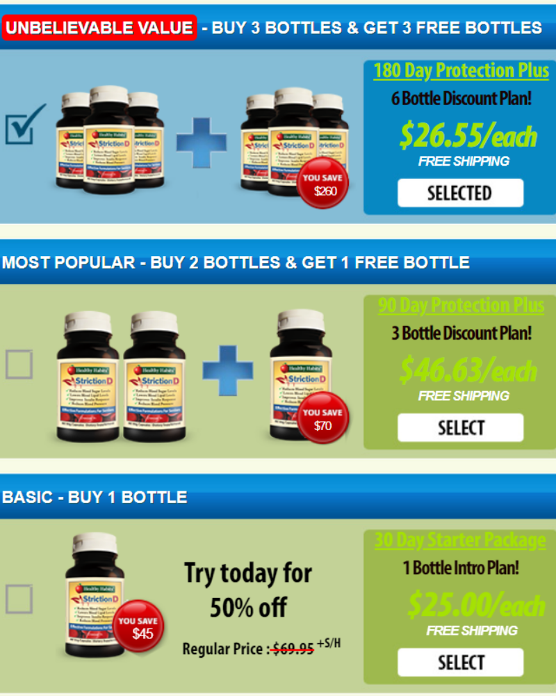 - Buy three bottles of Striction D for $26.55 each and get three bottles for free. Free US Shipping.