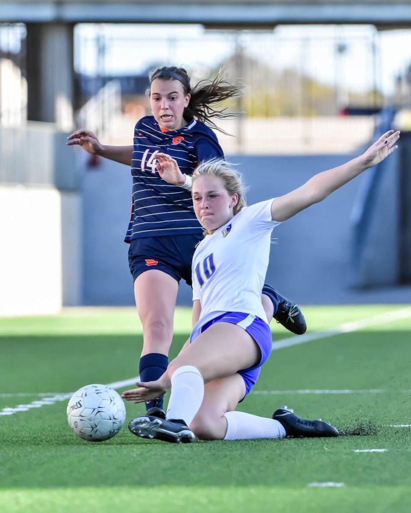 - Elkins’ sophomore Ellie Pitts (10) clears a ball, momentarily interrupting Seven Lakes sophomore midfielder Waggoner Townsen (14) breakaway opportunity on Thursday night at Legacy Stadium. (Photo by UDPhotos)