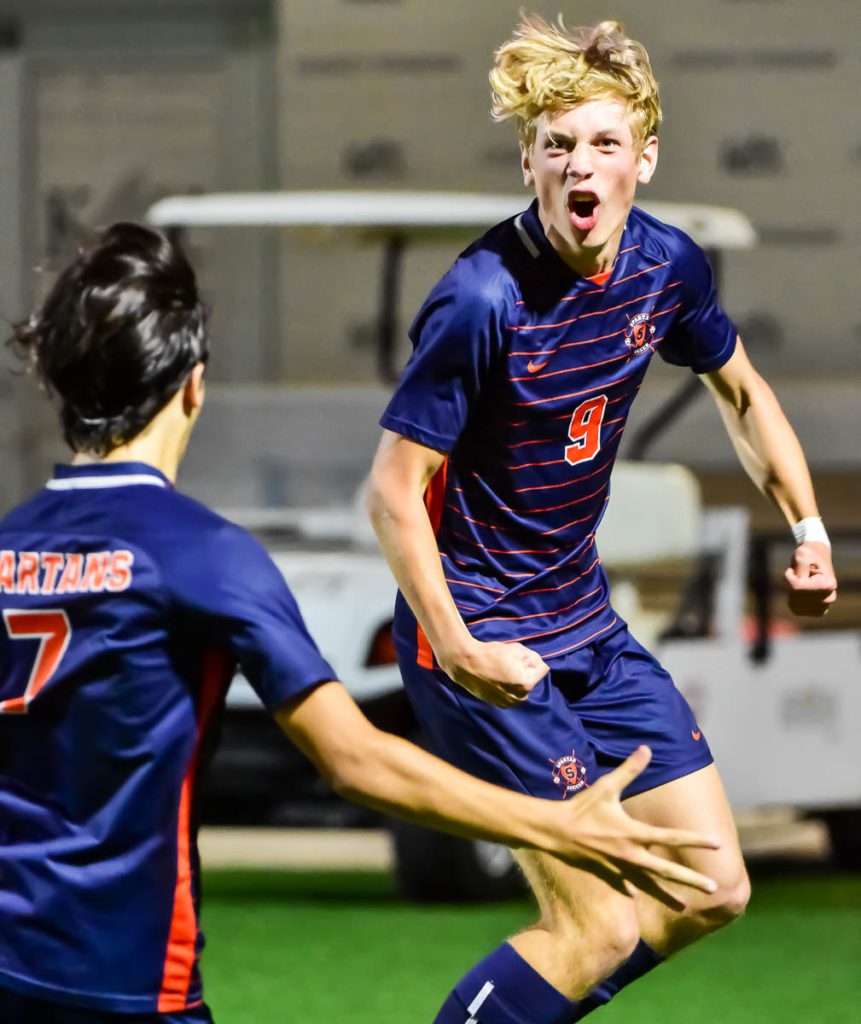 Spartan junior midfielder/forward Hunter Merritt (9) sparked a Seven Lakes celebration on Tuesday with a goal in the area playoffs after Seven Lakes trailed Cy Ridge late in the first half. Merritt’s goal ignited a rally, and in the end, Seven Lakes claimed a 3-2 victory. (Photo by UDPhotos)