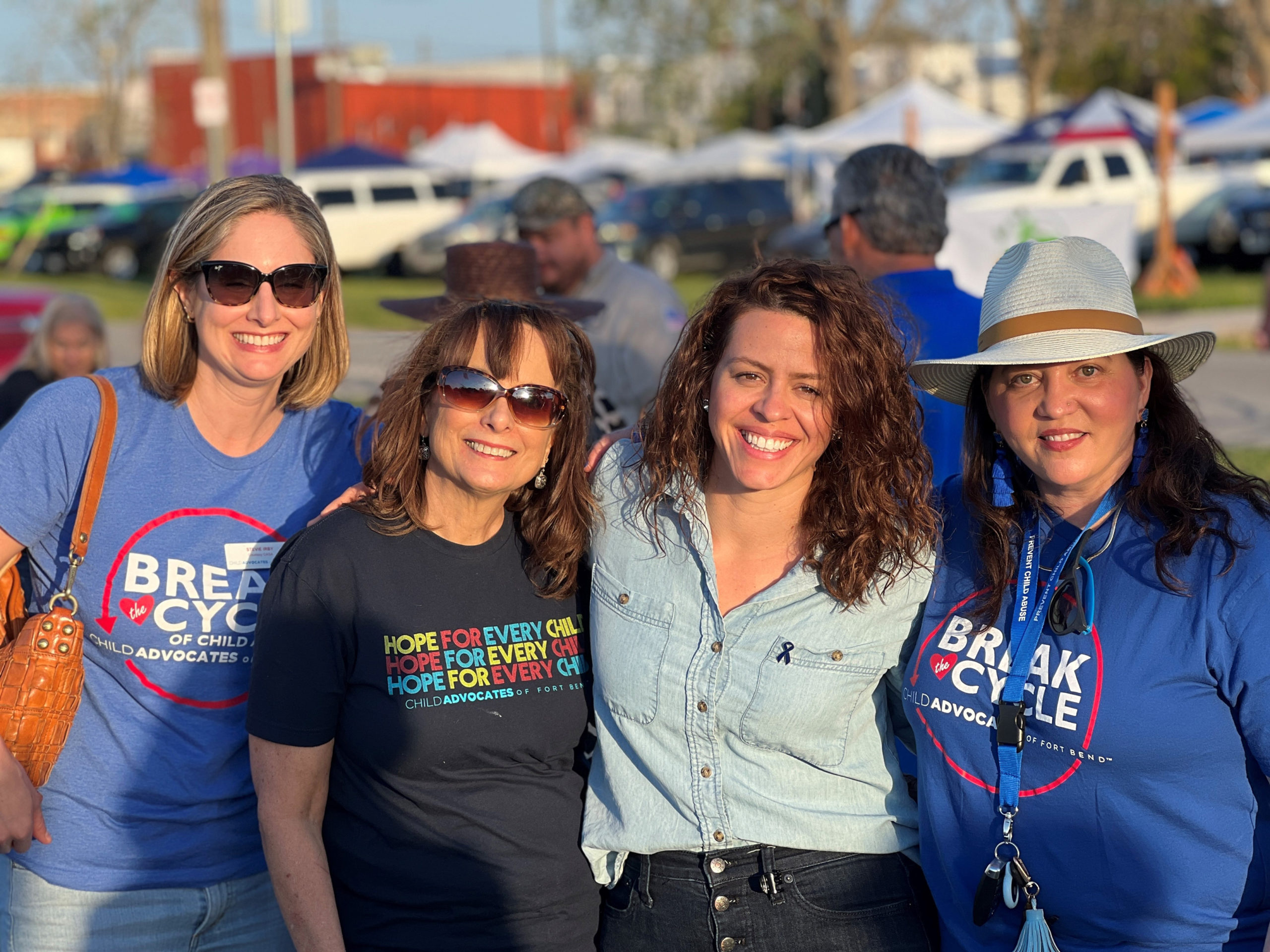 Child Advocates of Fort Bend and the City of Richmond joined forces on Friday, April 1 to kick off Child Abuse Prevention Month with a fun, family friendly evening at Wessendorff Park in Richmond, complete with a movie, t-shirts and activities for the whole family. Child Advocates of Fort Bend Board President Nancy Olson welcomed everyone and thanked them for attending. Child Advocates of Fort Bend Community Outreach Coordinator Lindsey Castellanos shared some child abuse statistics and prevention tips and Richmond Mayor Becky Haas read a proclamation from the City of Richmond. Child Advocates of Fort Bend’s Volunteer Council, Exchange Club of Sugar Land, Exchange Club of Fort Bend, Aguirre & Fields, ARTreach, Kustom Cyclez, BACA – Gulf Coast Chapter and Richmond Rotary provided awareness information and family activities for those in attendance. Following the ceremony, families enjoyed a showing of the movie Peter Rabbit 2 courtesy of the City of Richmond. Shown (L to R) are: Stevie Irbie, Carollynn Thesing, April Shaver and Rhonda Kuykendall.