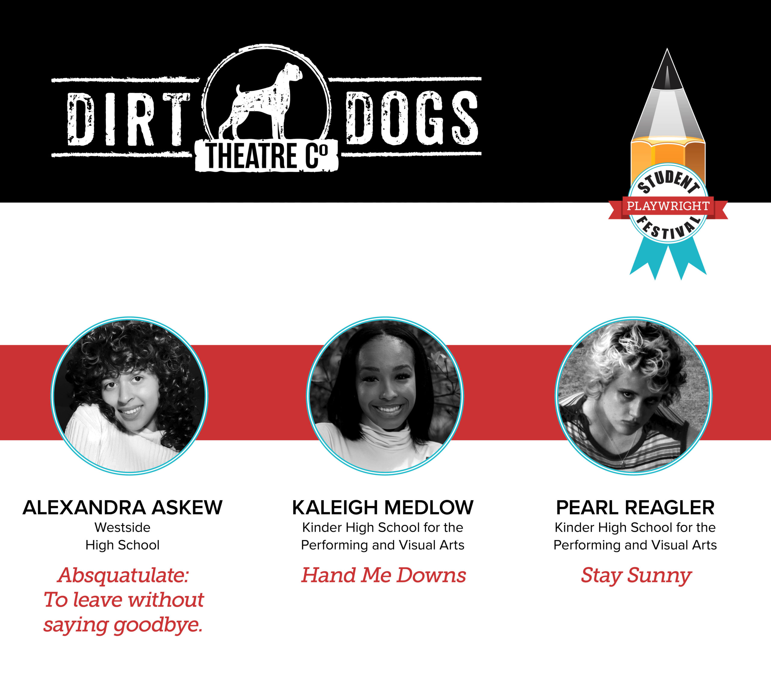 Plays by local high school seniors, Alexandra Askew, Kaleigh Medlow, and Pearl Reagler have been chosen by Dirt Dogs Theatre Co. for its 2022 Student Playwright Festival. Each selected playwright is awarded a $500 scholarship and is paired with a Houston-based playwright as a mentor to fine-tune their plays and prepare them for production. The students will be the guests of honor as the plays are performed at the MATCH – Midtown Arts & Theater Center Houston. Scholarships for the 2022 festival have been graciously underwritten by the J. Flowers Health Institute.