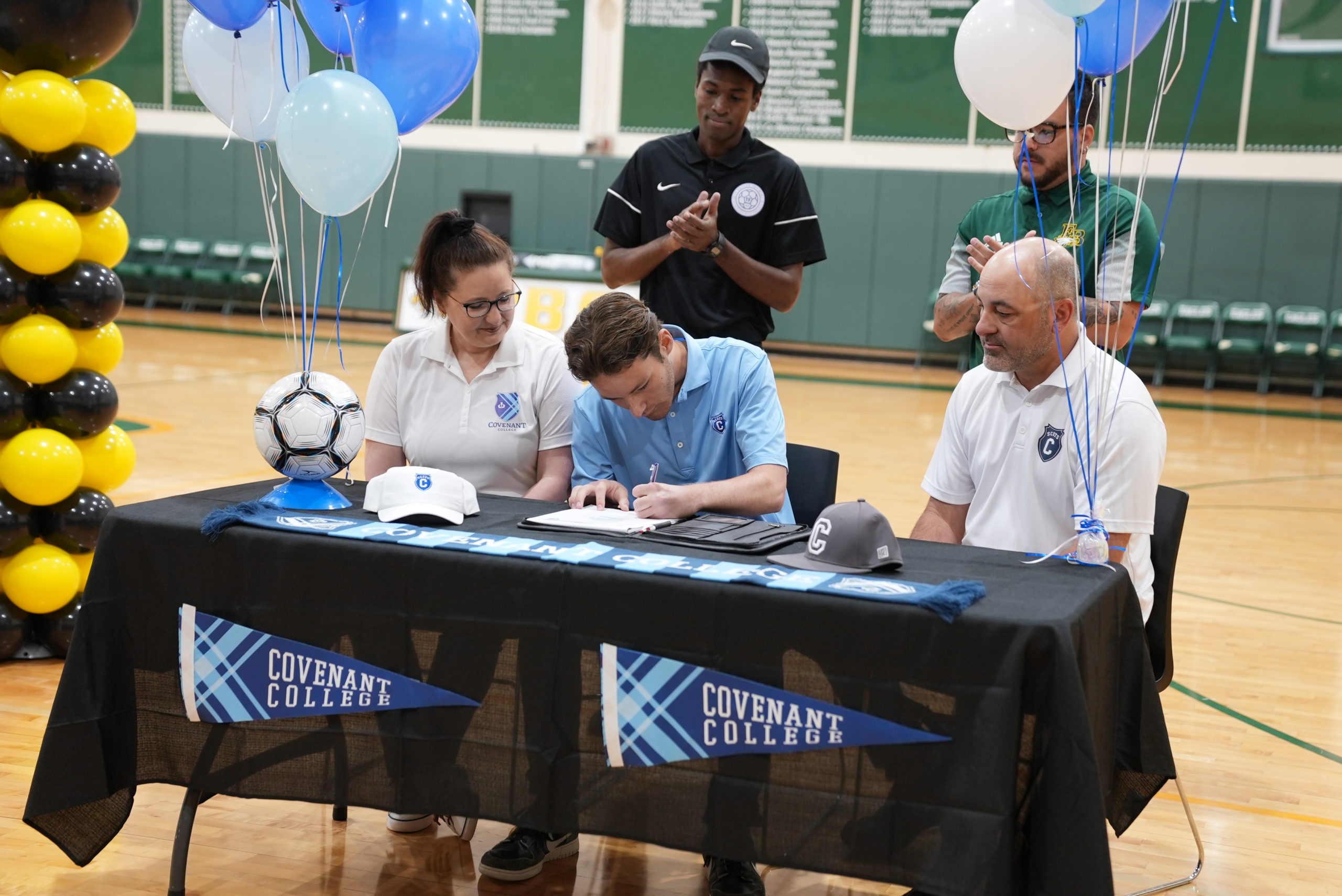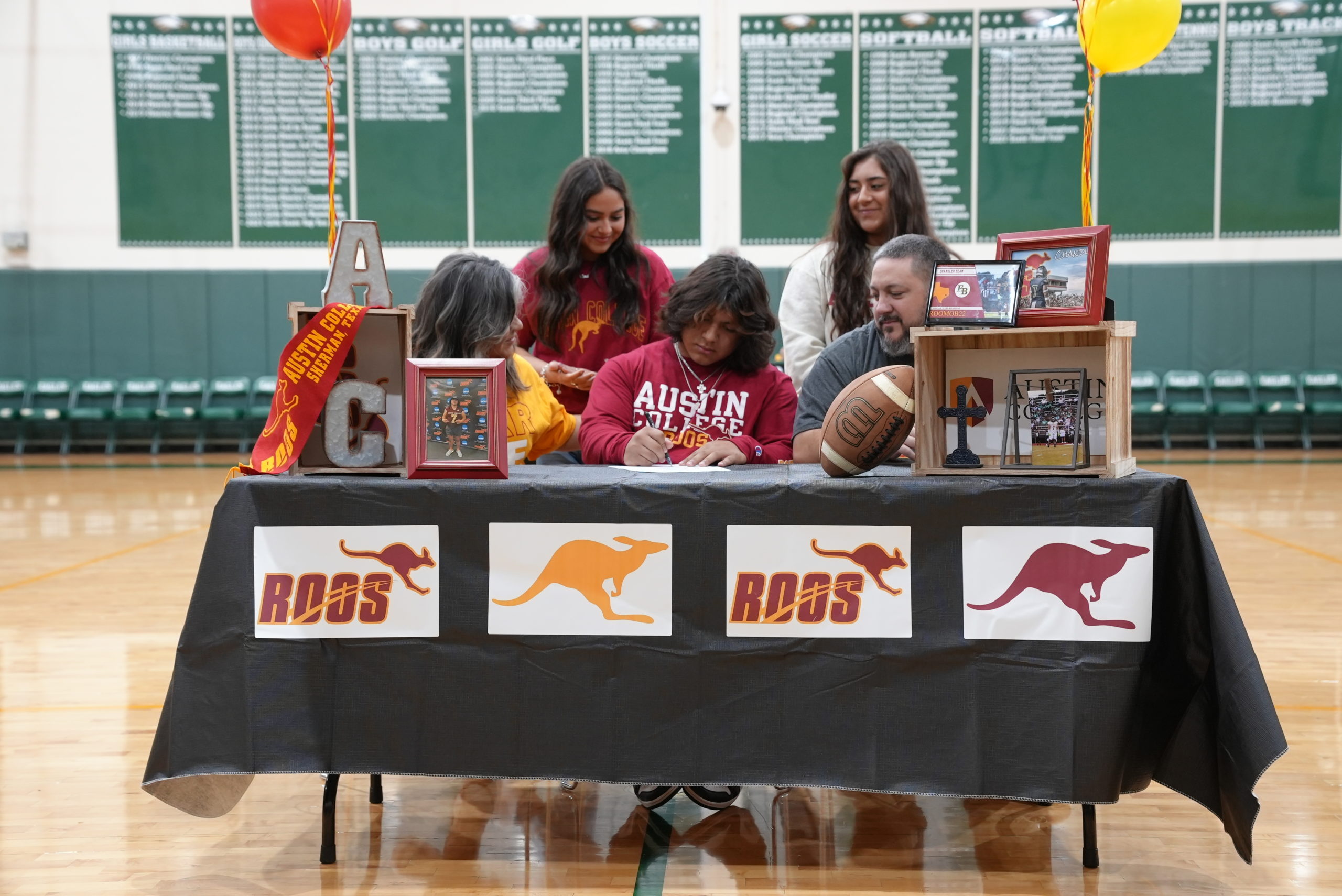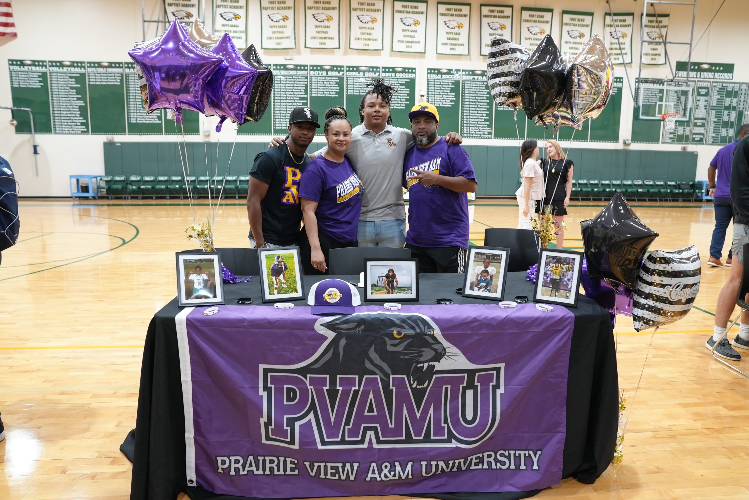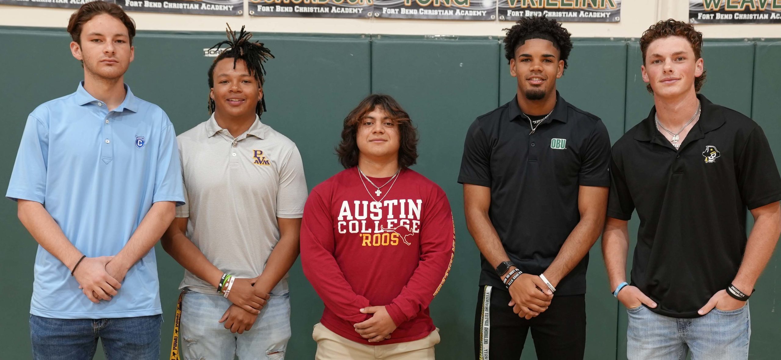 Fort Bend Christian Academy students and families gathered on campus today, Tuesday, April 12, 2022, to celebrate five outstanding athletes as they signed National Letters of Intent to play sports at the collegiate level. Four athletes signed to play football, and one athlete signed to play soccer.