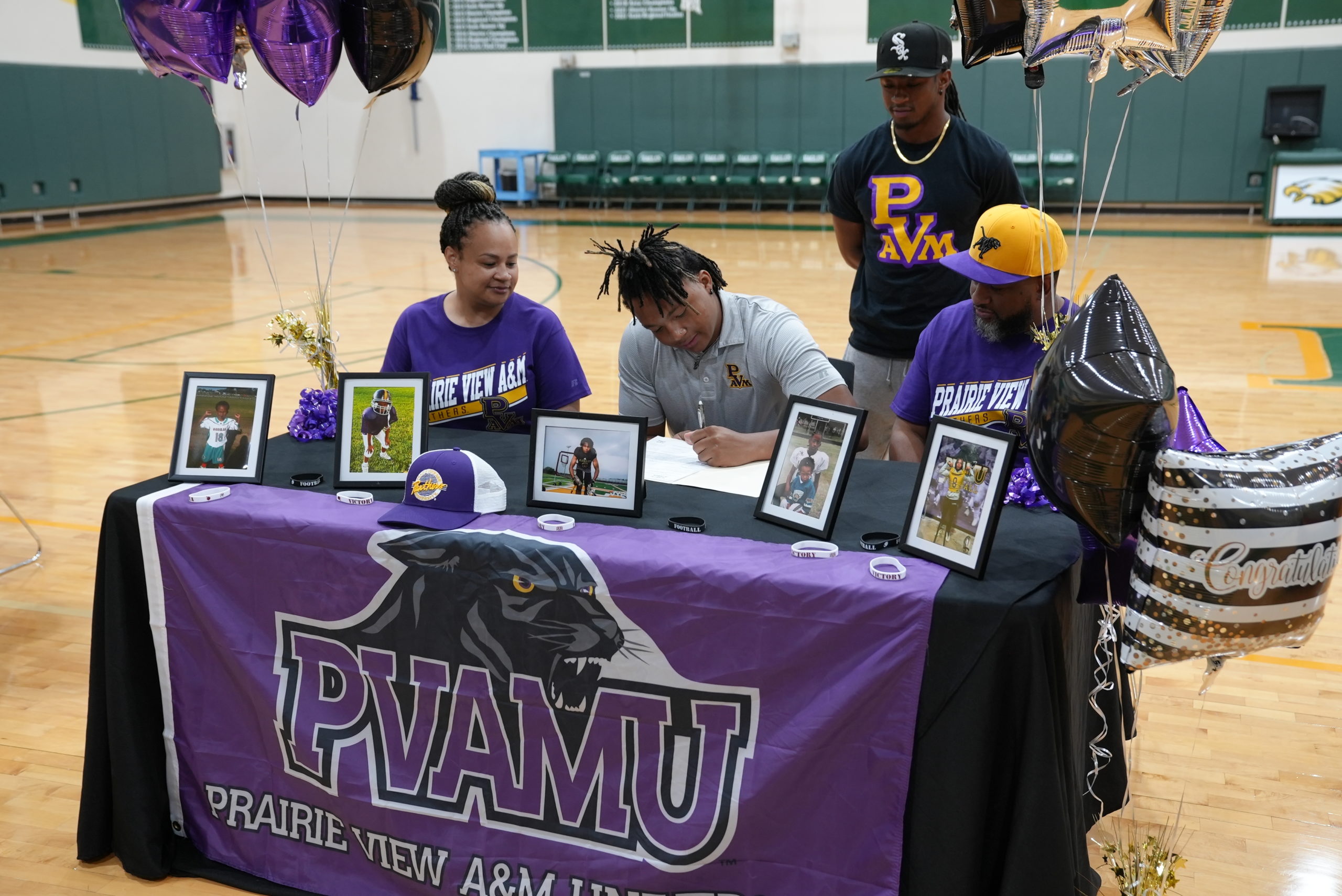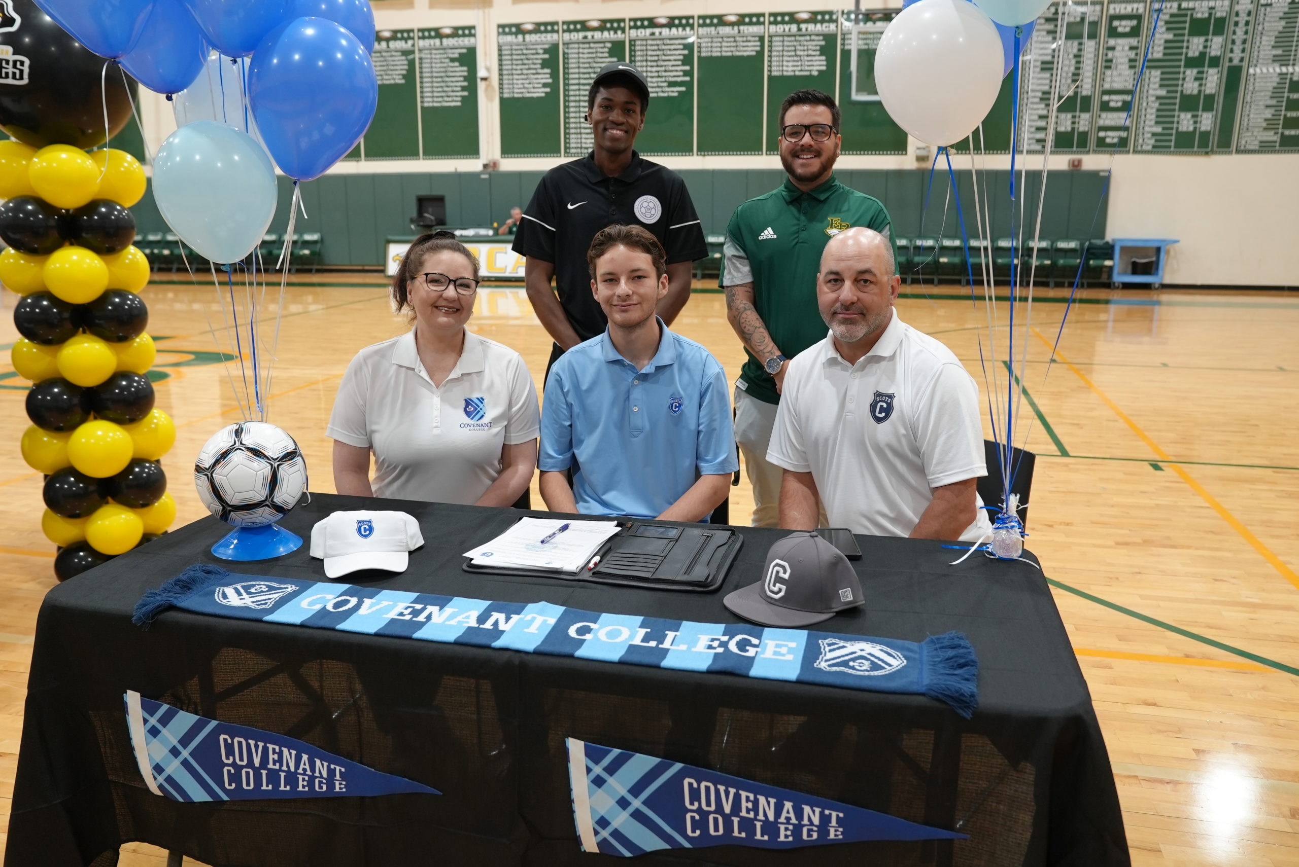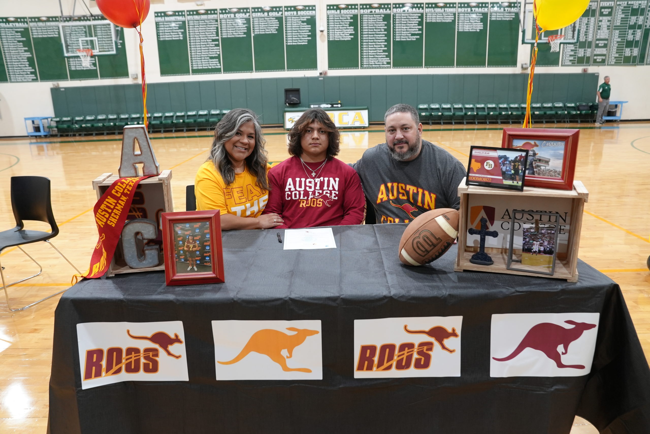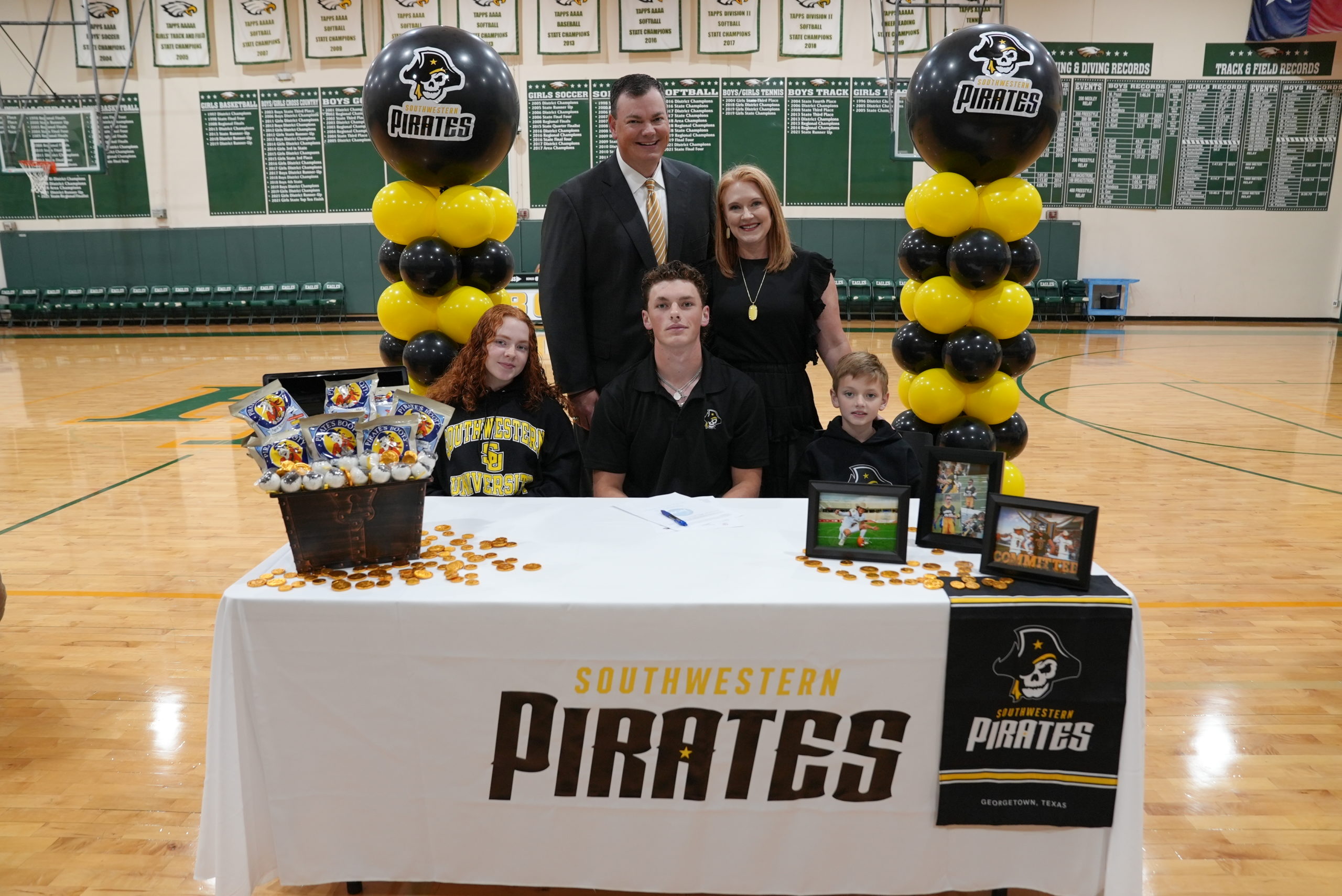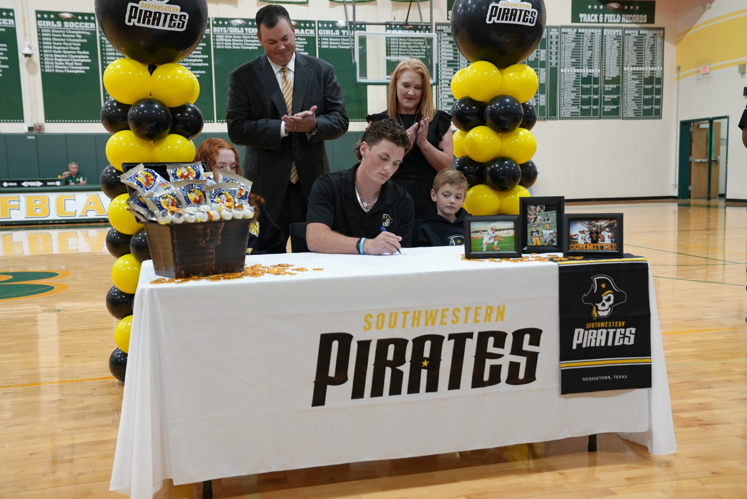 Fort Bend Christian Academy students and families gathered on campus today, Tuesday, April 12, 2022, to celebrate five outstanding athletes as they signed National Letters of Intent to play sports at the collegiate level. Four athletes signed to play football, and one athlete signed to play soccer.