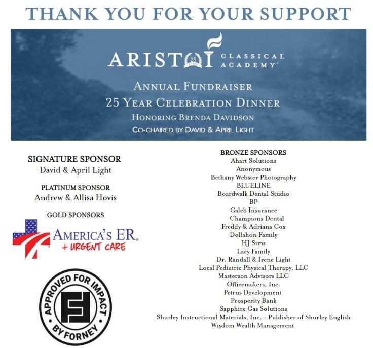 Aristoi Classical Academy sincerely thanks the sponsors, families, and friends for their generous support of Aristoi’s largest fundraiser of the year. Aristoi’s 25 Year Celebration Dinner and Fundraiser honoring Superintendent, Brenda Davidson, raised more than $156,000, with all proceeds directly benefiting the tuition-free, K-12, public charter school.