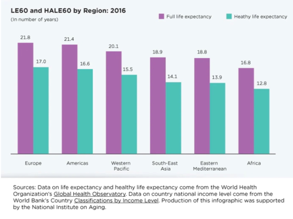 According to Geographical Health Organization (WHO) data on Life expectancy and Healthy life expectancy, HALE60 was around a quarter shorter than LE60 in all world regions (7).