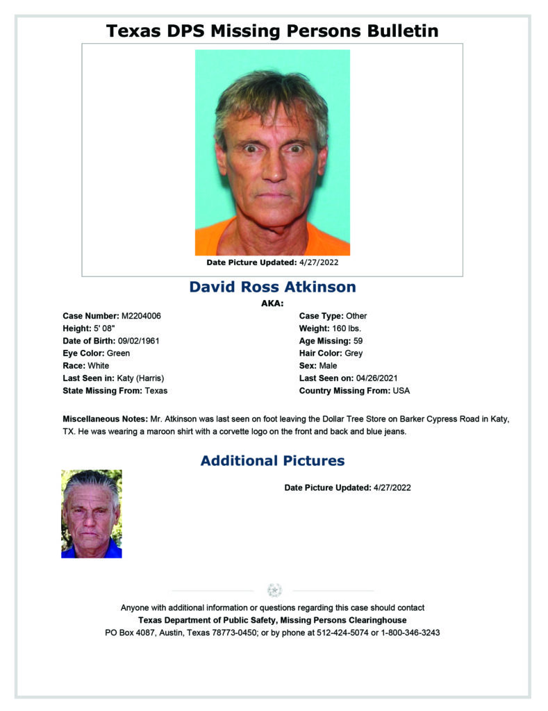 Harris County Sheriff Deputies David Wilson, Richard Spinelli and Mark Brown are the contacts in case number 2105-01404. Please give the department a call today if you recognize David Atkinson, who would be 60 years old now. The department phone number is 713-755-7427.