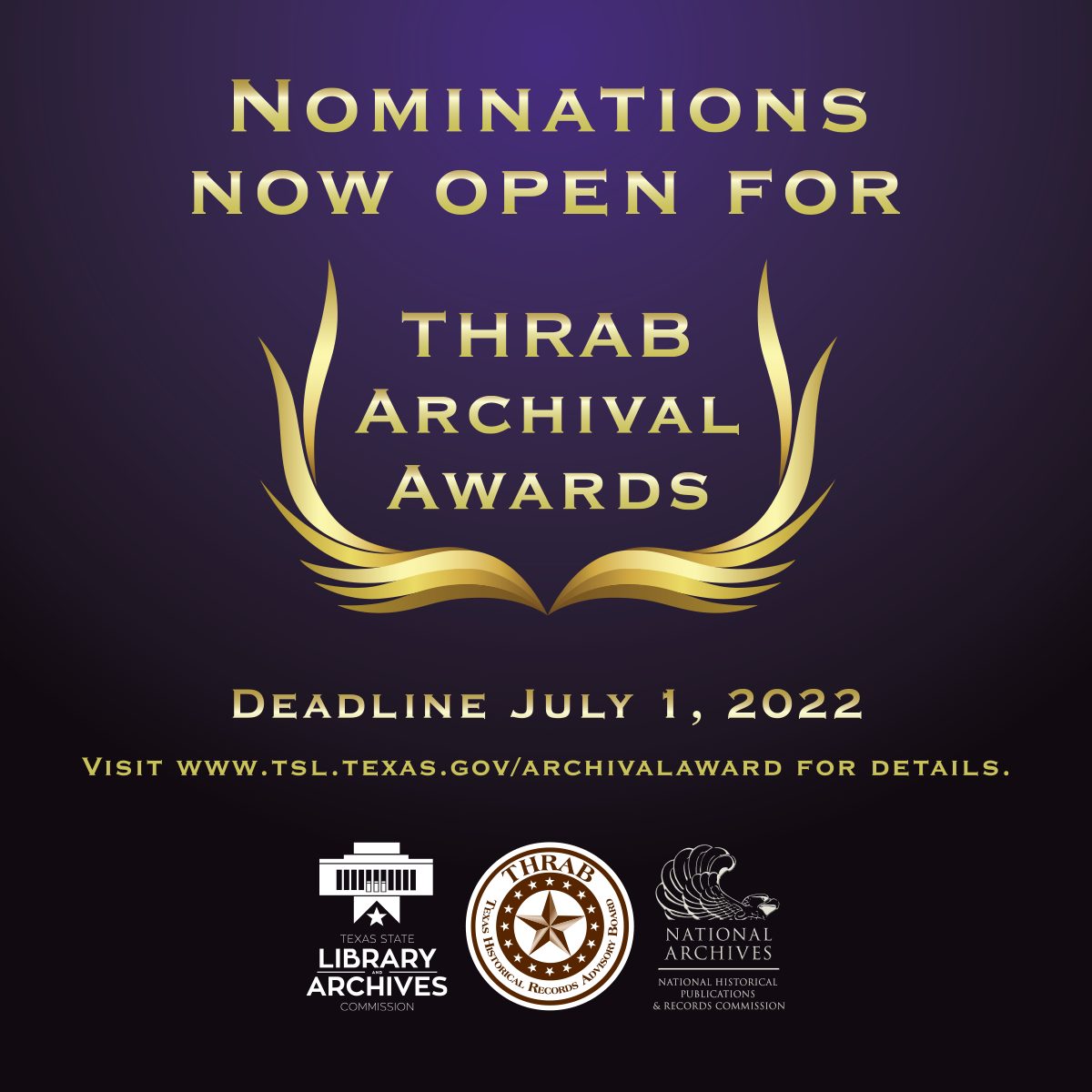 THRAB is accepting nominations through July 1 and will announce the recipients in October during Texas Archives Month. For nomination forms and additional information, visit www.tsl.texas.gov/archivalaward.
