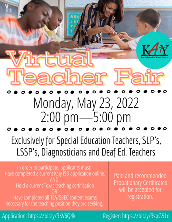 KATY, TX [May 18, 2022] – Katy ISD is hiring dedicated special education teachers, school speech-language pathologists (SLP), licensed specialists in school psychology (LSSP), diagnosticians and deaf education teachers. Interested individuals are encouraged to participate in the District’s virtual job fair on Monday, May 23.
