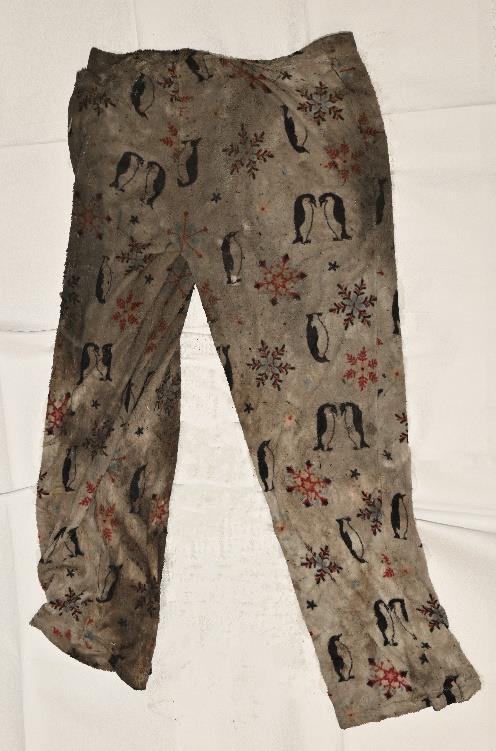 The decedent was found in an advanced state of decomposition lying in a wooded area behind a business. She has long, dark, curly/wavy hair with some gray. The decedent was wearing a light colored, short-sleeved t-shirt and penguin – snowflake patterned fleece pants, as pictured below, “Secret Treasures” brand, size M. She was also wearing a white metal cross on a white metal chain. The decedent has several skeletal repairs including a left hip replacement, metal rod in the left tibia (lower leg) and metal plate in the left radius (forearm). She also appeared to have a remote gunshot wound of the lower right leg.