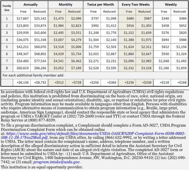 If a household member becomes unemployed or if the household size increases, the household should contact the food service office. Such changes may make the children of the household eligible for benefits if the household’s income falls at or below the attached current income eligibility guidelines.