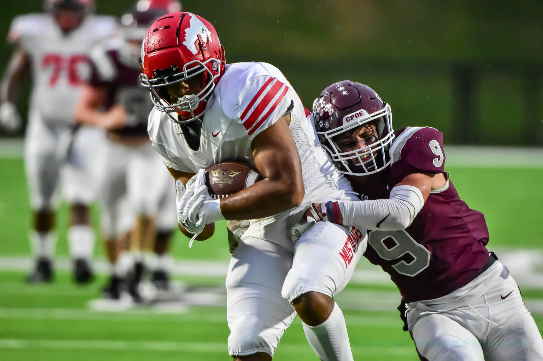 - Cinco Ranch junior DB Yetxiel Perez Gilbes (9) struggles to drag down a North Shore receiver after a long gain by the Mustangs on Friday. (Photo by Terry Carter/UDPhotos)