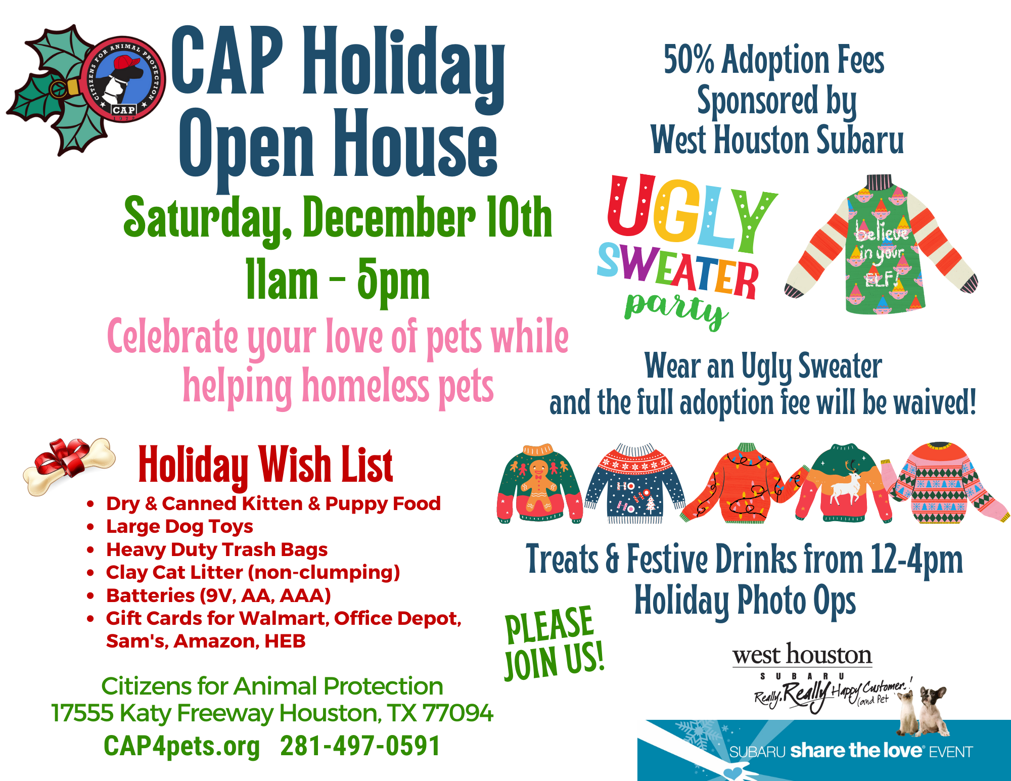 As a special holiday treat, you are invited to the CAP Holiday Open House on Saturday, December 10th. West Houston Subaru will be sponsoring 50% adoption fees, and adopters who wear an Ugly Holiday Sweater will have their adoption fee completely waived.