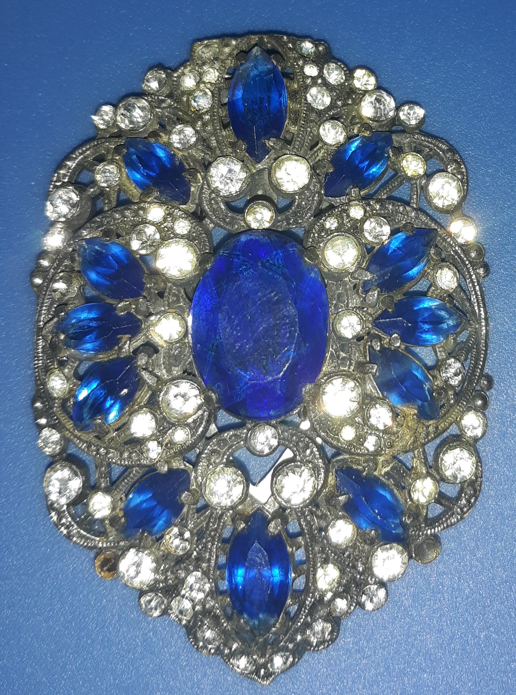 The importance of a brooch’s setting –preferably in precious metals–should not be overlooked. Look for classic settings like circles, wreaths, snowflakes, or flower forms. Prongs are a quality indicator for both fine jewelry or costume jewelry brooches. Look for prongs holding in crystals, gemstones, or other cut stones and remember, the more prongs the better. Most faceted cut gemstones are set with at least four, but even better if there are six, prongs. Prongs should be curved and tightly set to secure the gemstone on a brooch. Pinback clasps can come in many types including c-clasps or rotating clasps to secure the brooch to the clothing garment or coat. These settings are important to value and the look of a brooch.