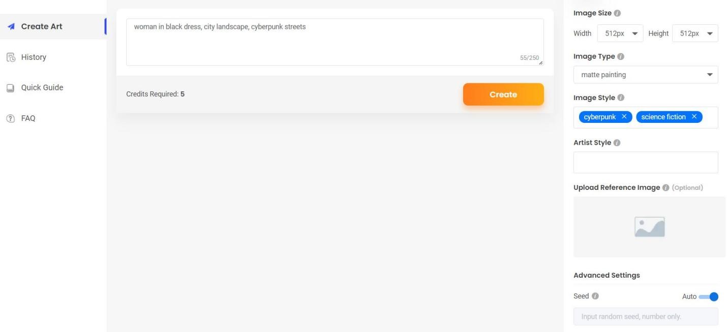 If you have special interests, you may also select the Artist Style, which will prompt the text to image tool to make art in the style of the selected artist. On the same note, it is also possible to supply a reference image for the program to follow when it is developing the AI art for you. There are more sophisticated settings available below, with information on each choice. If you forget to choose a high-resolution output, you can choose another tool VanceAI Image Upscaler to get super resolution artworks.