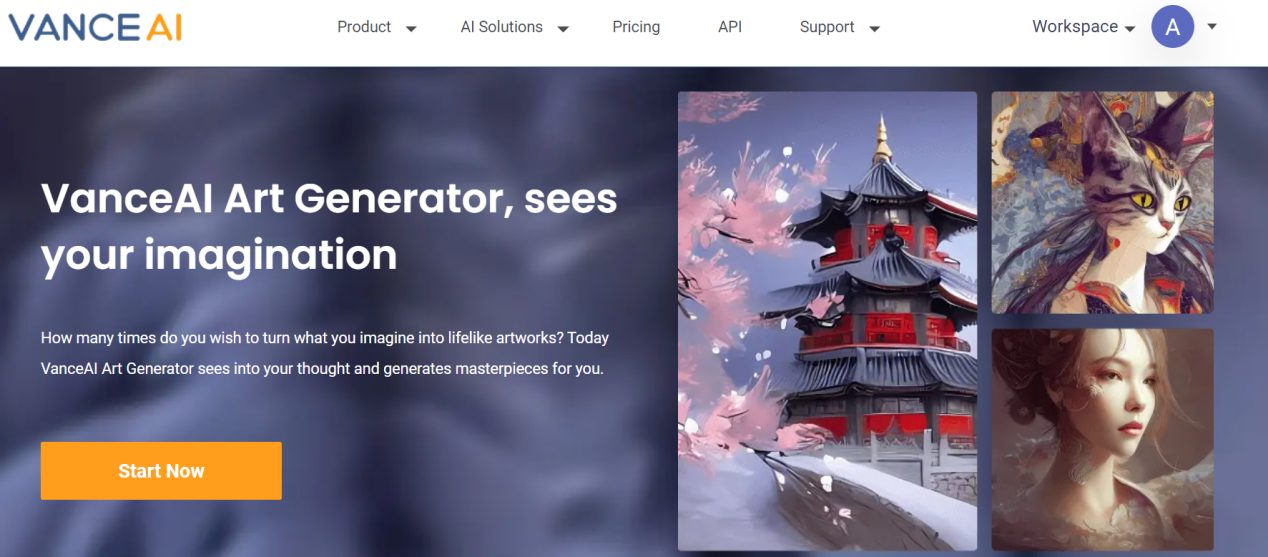 - To gain access to any VanceAI tool, simply click on the AI Image Generator provided for the tool to be sent to its home page. Once you’ve arrived at the main page, simply click the Start Now button to access the Workspace.