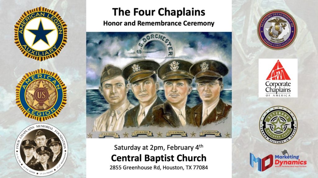 In association with the Four Memorial Chaplains Foundation, American Legion Auxiliary Unit 164, 22nd District Department of Texas American Legion, American Legion Post 164, Marine Corps League Detachment 324, Corporate Chaplains of America, Network In Action Veterans Business Force, Katy Christian Magazine, Central Baptist Church., and Marketing Dynamics.