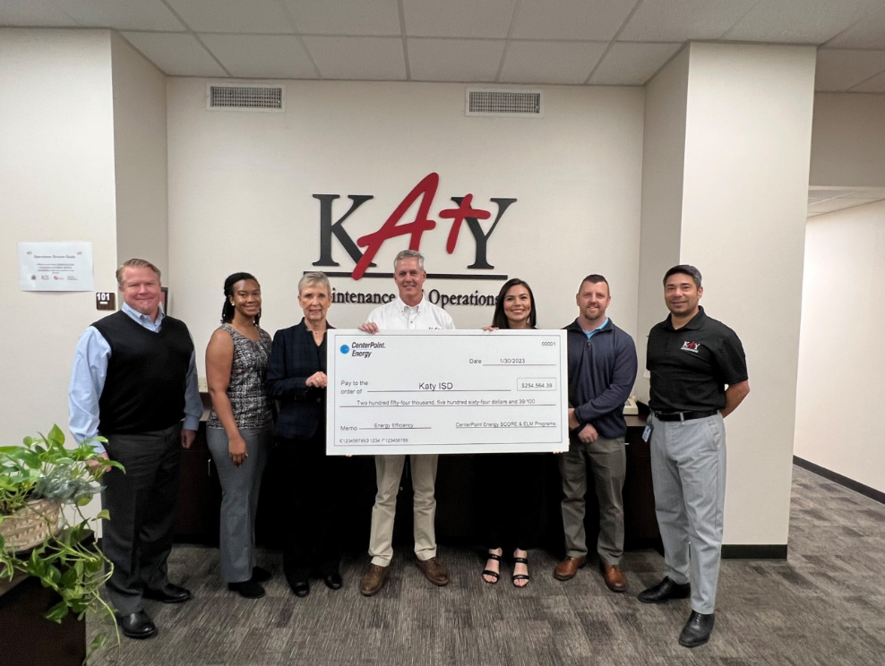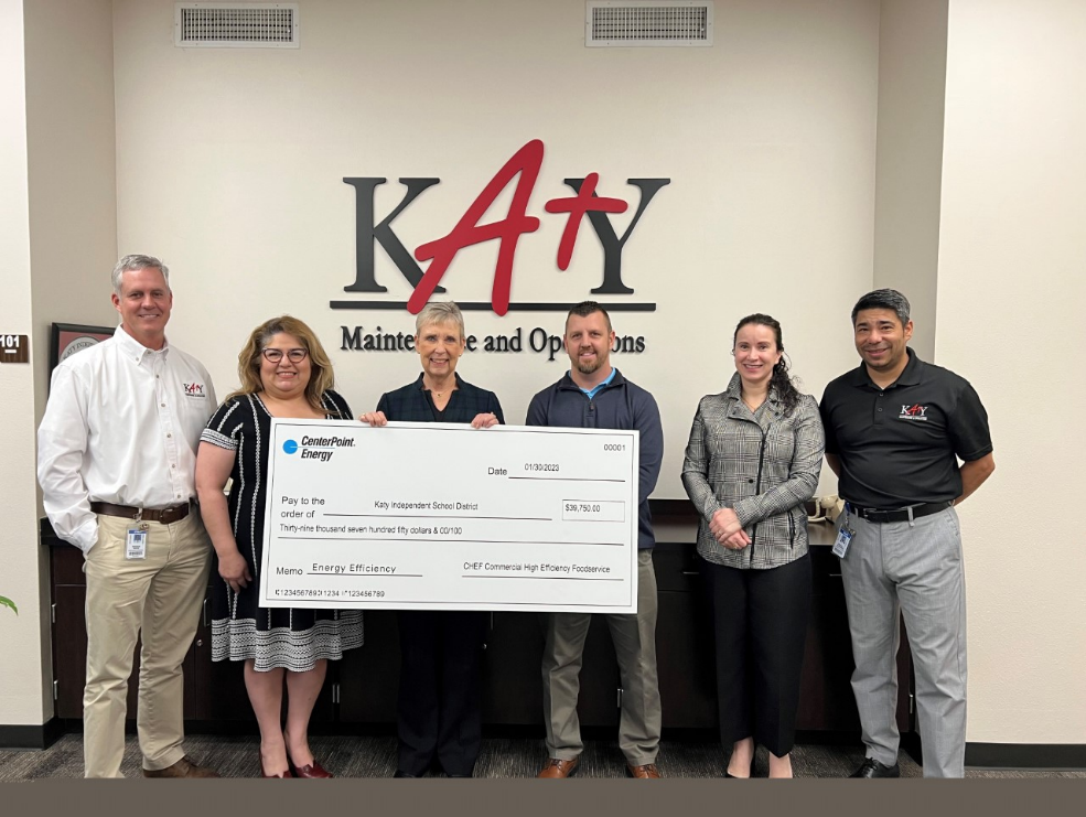 Katy ISD was recently awarded $254,564.39 as part of the CenterPoint Energy SCORE (Schools Conserving Resources and Energy) Program and $39,750 through the new Commercial High-Efficiency Foodservice (CHEF) Program for its energy-saving efforts throughout the District.