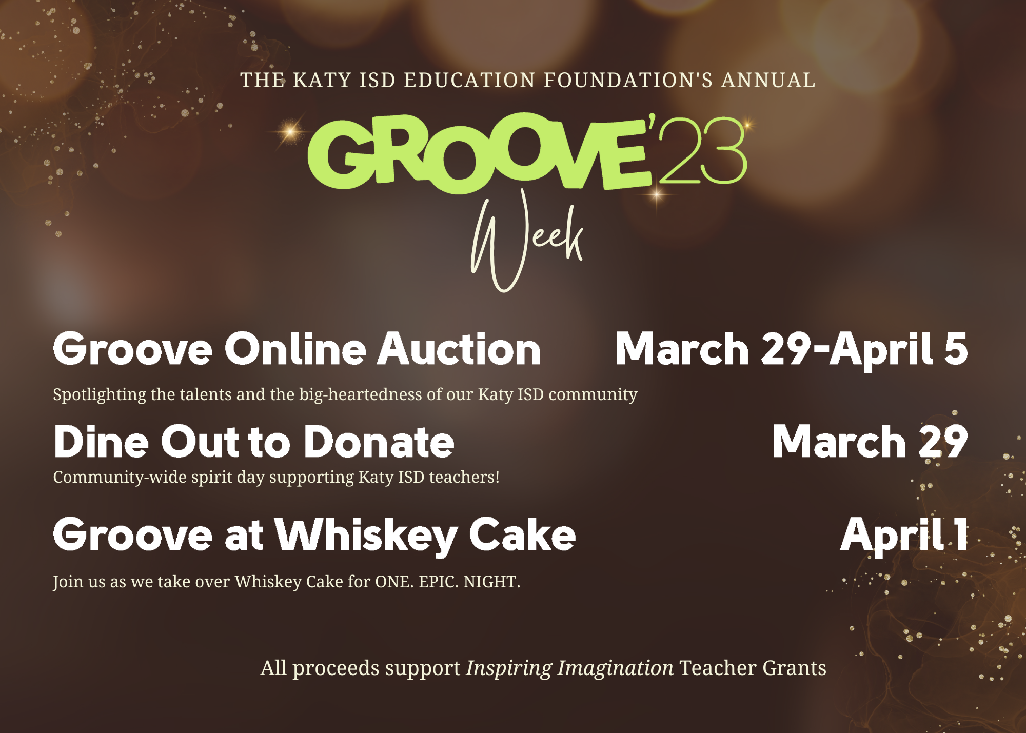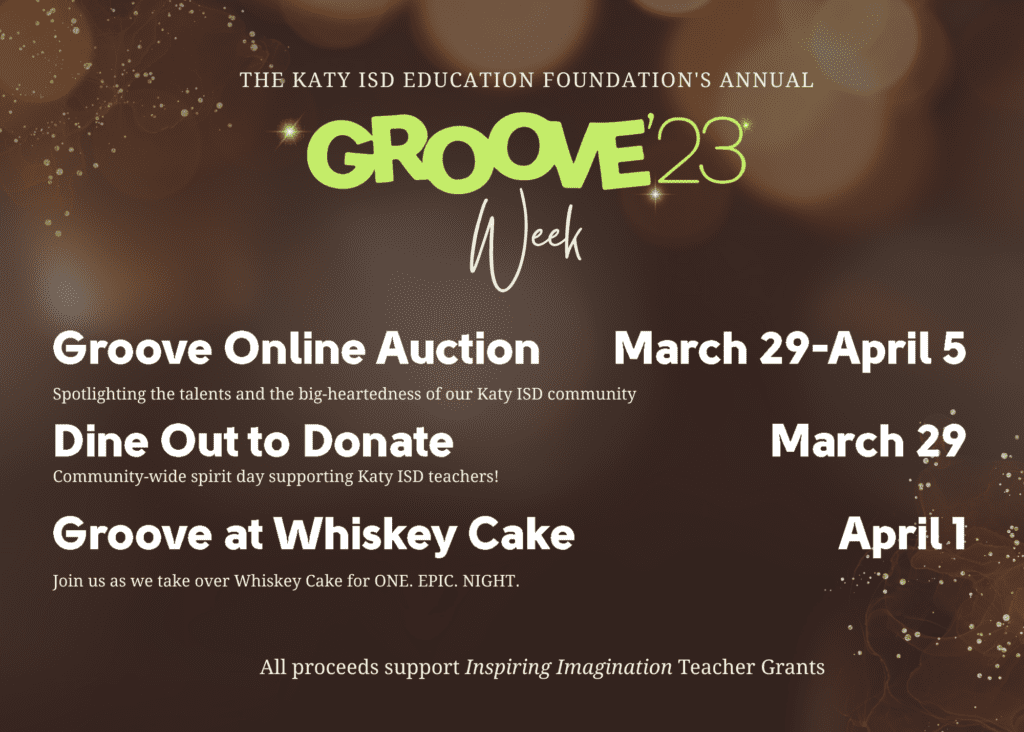 The Katy ISD Education Foundation announces GROOVE23, a week-long celebration uniting the community in support of Katy ISD teachers. GROOVE events include Dine Out to Donate, GROOVE at Whiskey Cake and GROOVE online auction. Proceeds from all three events benefit the Foundation and its Inspiring Imagination teacher grant program. The Katy ISD Education Foundation has awarded $2.6 million in grants to Katy ISD teachers over the past ten years.