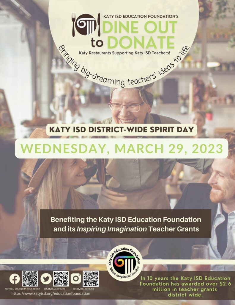 The Katy ISD Education Foundation will partner with an impressive roster of area restaurants Wednesday, March 29 for its second annual Dine Out to Donate event, a community-wide spirit day through which participating restaurants will contribute a portion of the day’s proceeds to the Education Foundation.