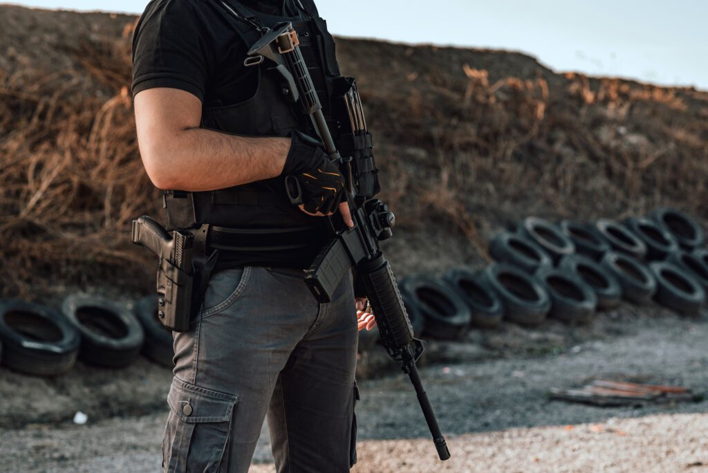 Image of armed man with rifle and gun standing outdoors, close-up.