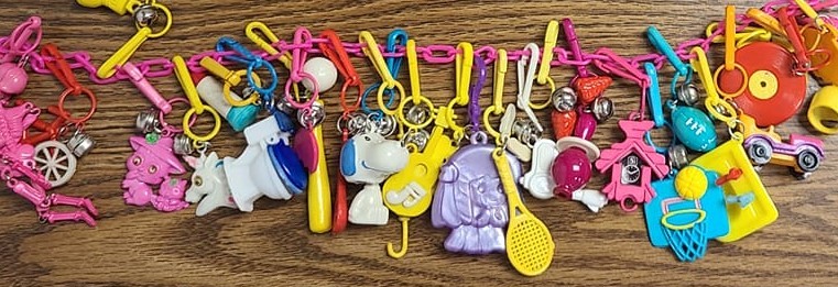 This list of bell charm types illustrates how wild collectors were about buying the tiny charms. It shows how the bright, neon colored charms were traded actively and with vigor. Many collectors spent months looking for a specific, ever-elusive figural charm of an Olympic swimmer or a tub of Play-Doh. Others attempted to amass the largest collection of bell charms. They’d continually clip the newest charm added to their collection to a bright pink or yellow link chain which could be worn as a necklace or hung from a bedroom mirror. Some dedicated collectors would collect bell charms and keep them in a protective vinyl binder housing their collectibles for both storage and display.