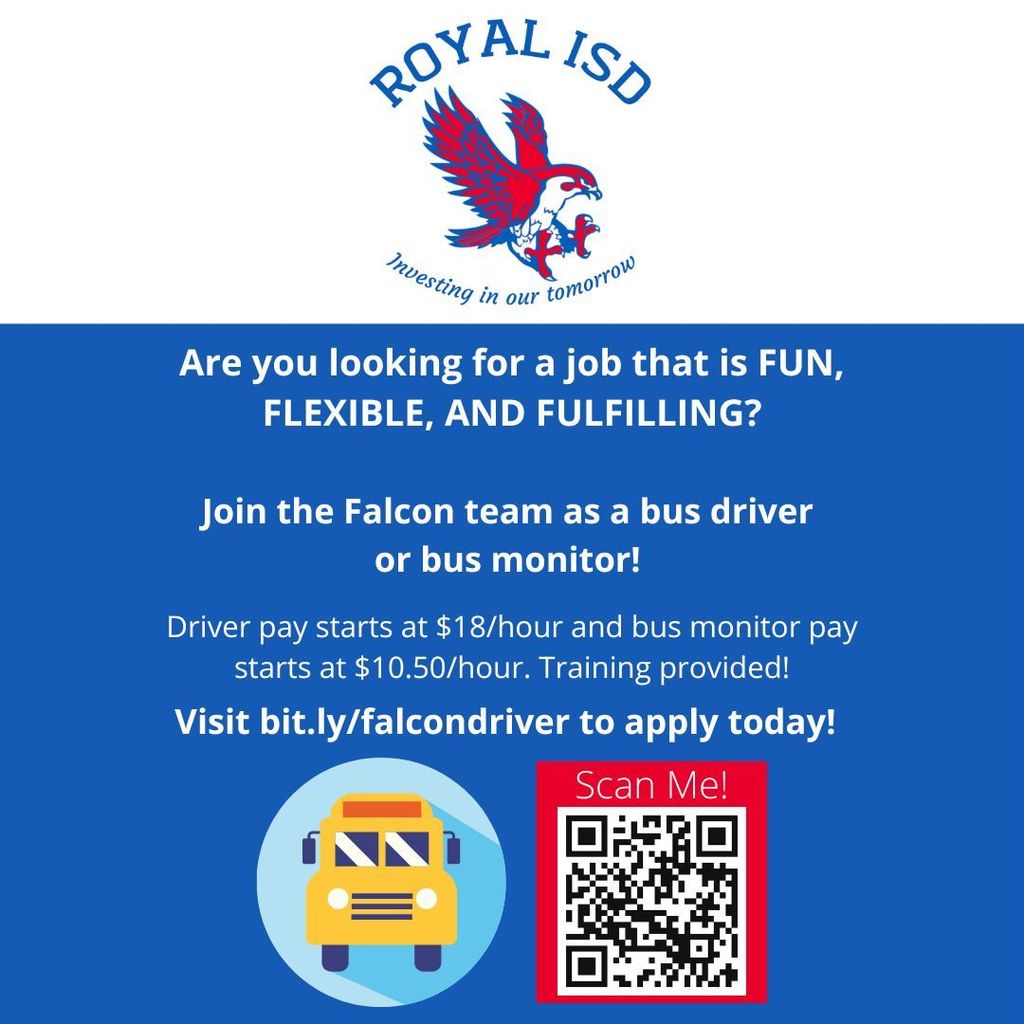 Are you looking for a job that’s fun, flexible, and fulfilling? Join the Falcon team as a bus driver or bus monitor! Visit bit.ly/falcondriver or scan the QR code to apply today! Please share with anyone who might be interested!