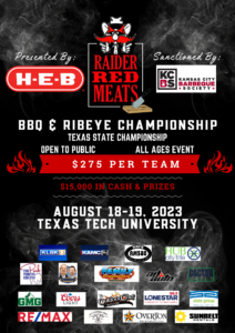 2023 Raider Red Meats Barbeque and Ribeye Championship Cook-Off hosted by Texas Tech University in collaboration with H-E-B and the Kansas City Barbeque Society (KCBS).